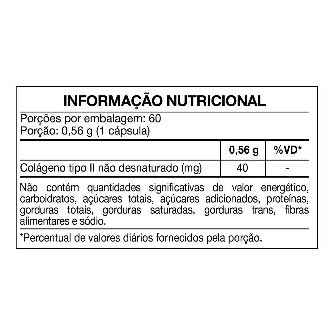 - Quantidade de colágeno tipo II por cápsula: conforme tabela nutricional do fabricante.