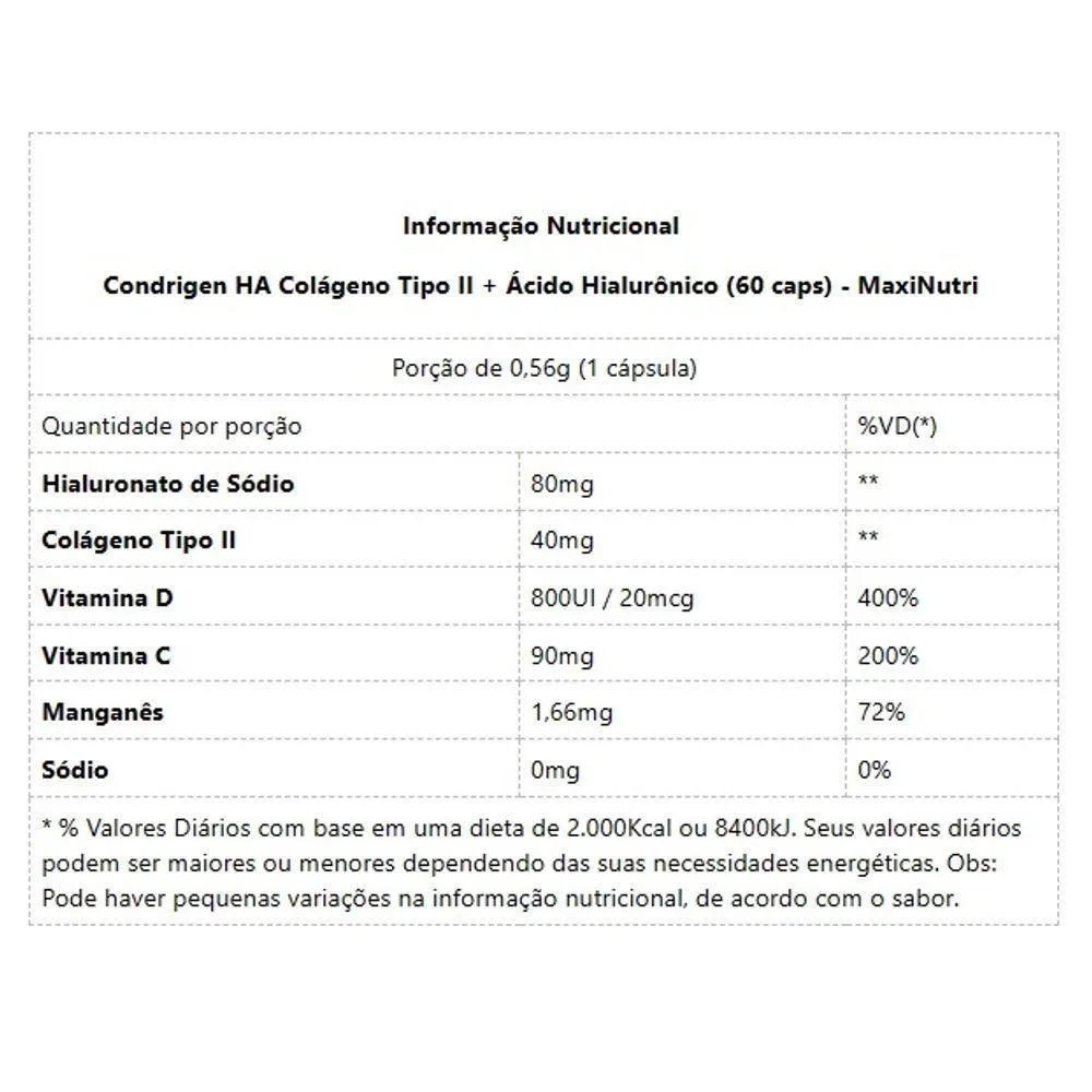 Informação Nutricional Condrigen HA Colágeno Tipo II + Ácido Hialurônico (60 caps) - MaxiNutri Porção de 0,56g (1 cápsula)Quantidade por porção%VD(*)Hialuronato de Sódio80mg**Colágeno Tipo II40mg**Vitamina D800UI / 20mcg400%Vitamina C90mg200%Manganês1,66mg72%Sódio0mg0%* % Valores Diários com base em uma dieta de 2.000Kcal ou 8400kJ. Seus valores diários podem ser maiores ou menores dependendo das suas necessidades energéticas. Obs: Pode haver pequenas variações na informação nutricional, de acordo com o sabor.