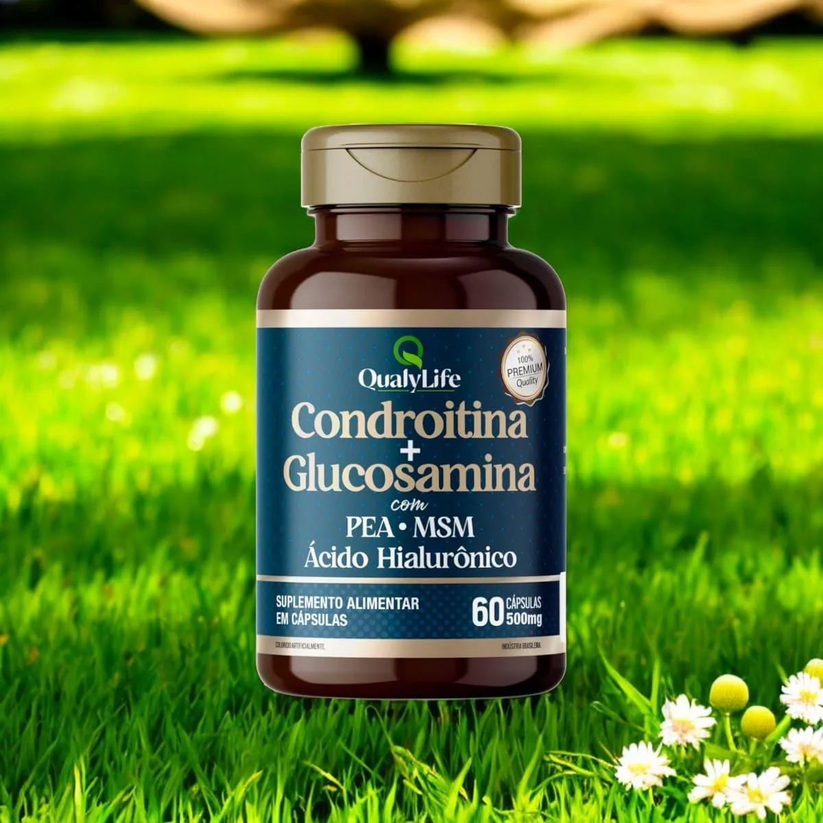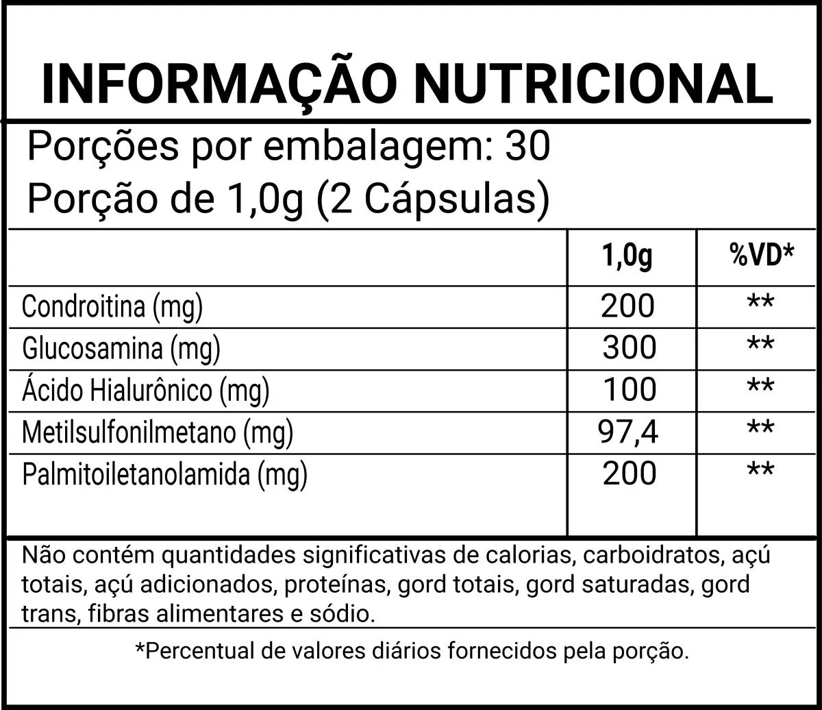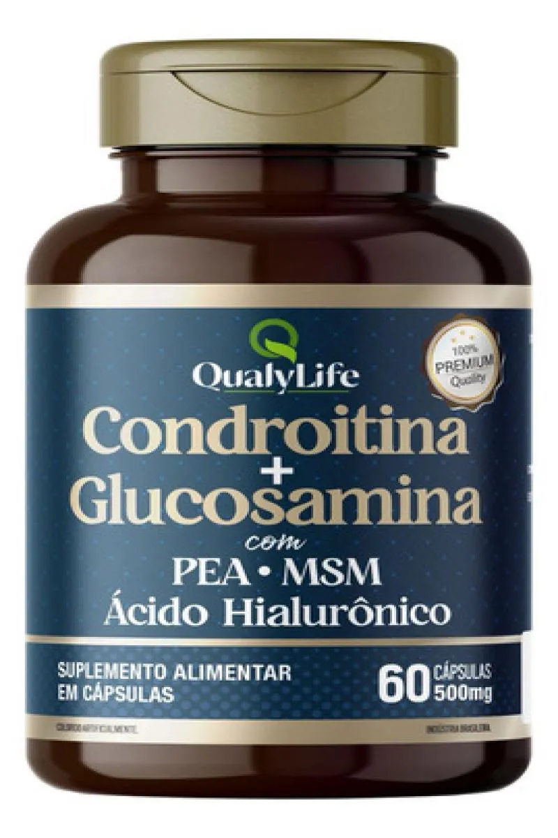 A Condroitina e Glucosamina da Qualylife é um suplemento alimentar formulado para promover a saúde das articulações. Cada cápsula contém uma combinação de sulfato de condroitina, cloridrato de glucosamina, palmitoiletanolamida (PEA), ácido hialurônico e metilsulfonilmetano (MSM), ingredientes reconhecidos por suas propriedades benéficas na manutenção da integridade das cartilagens e na promoção da flexibilidade articular. Composição: Ingredientes: Sulfato de condroitina, cloridrato de glucosamina, palmitoiletanolamida (PEA), ácido hialurônico, metilsulfonilmetano (MSM); Composição da Cápsula: Gelatina, umectante glicerina e corante dióxido de titânio.Não contém glúten. Recomendação de Uso: Ingerir 2 cápsulas ao dia, ou conforme orientação médica ou de nutricionista. Advertências: