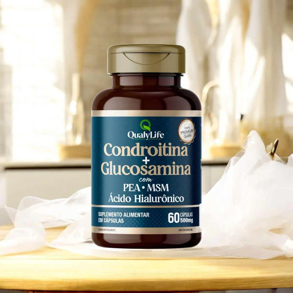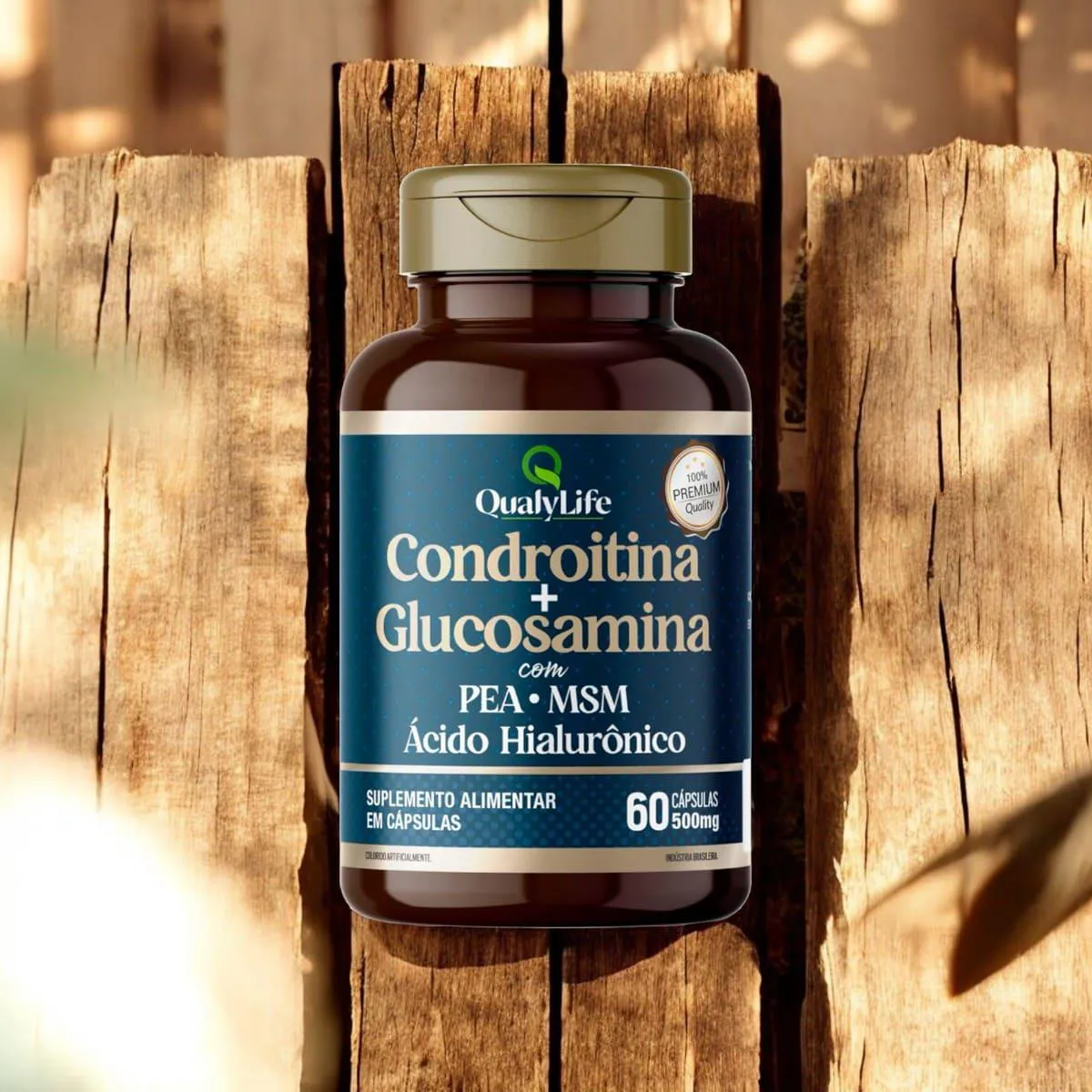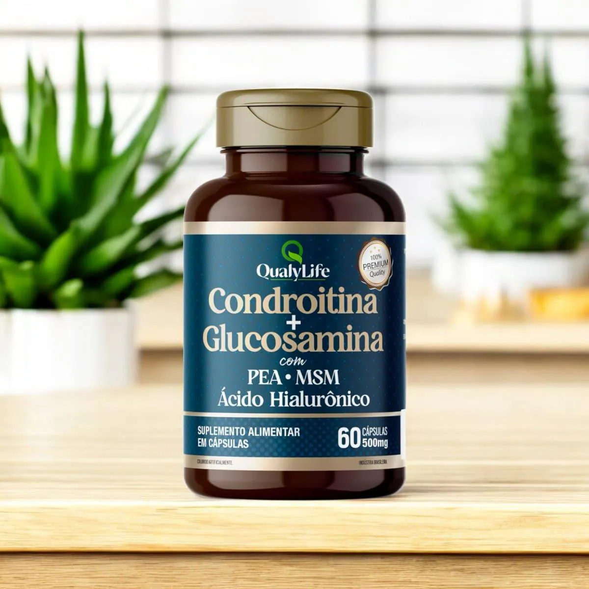 A Condroitina e Glucosamina da Qualylife é um suplemento alimentar formulado para promover a saúde das articulações. Cada cápsula contém uma combinação de sulfato de condroitina, cloridrato de glucosamina, palmitoiletanolamida (PEA), ácido hialurônico e metilsulfonilmetano (MSM), ingredientes reconhecidos por suas propriedades benéficas na manutenção da integridade das cartilagens e na promoção da flexibilidade articular. Composição: Ingredientes: Sulfato de condroitina, cloridrato de glucosamina, palmitoiletanolamida (PEA), ácido hialurônico, metilsulfonilmetano (MSM); Composição da Cápsula: Gelatina, umectante glicerina e corante dióxido de titânio.Não contém glúten. Recomendação de Uso: Ingerir 2 cápsulas ao dia, ou conforme orientação médica ou de nutricionista. Advertências: