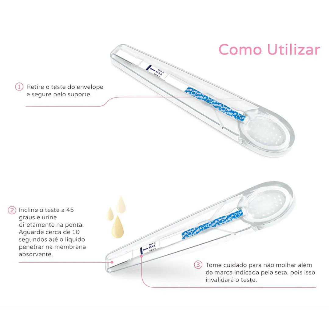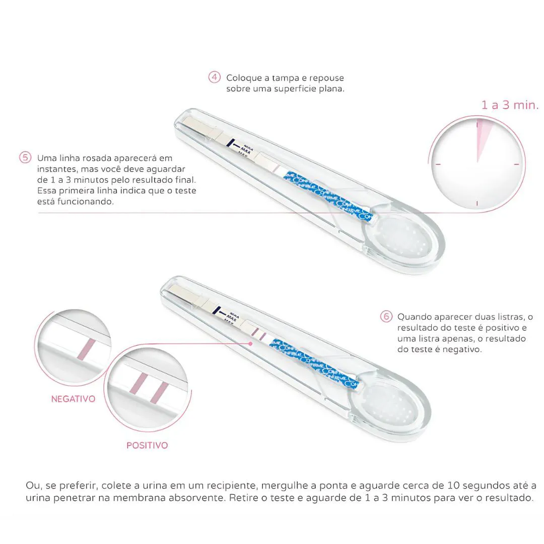 Resultado:2 linhas = Positivo (gravidez confirmada)1 linha = Negativo (não grávida)Sem linha = Teste inválido (repita com um novo teste)