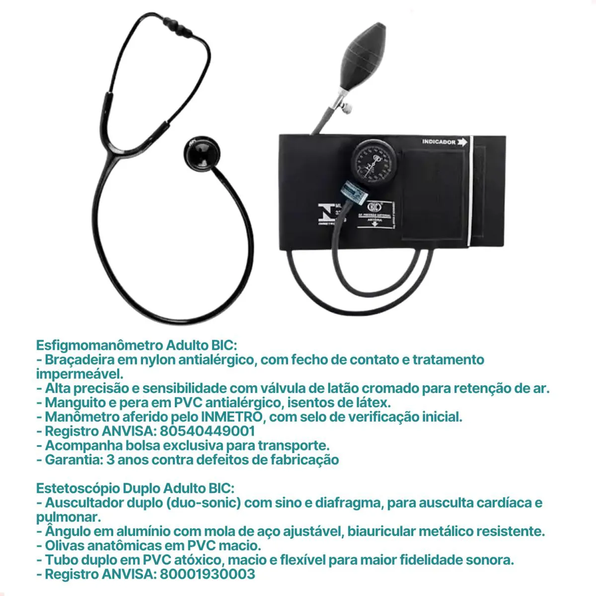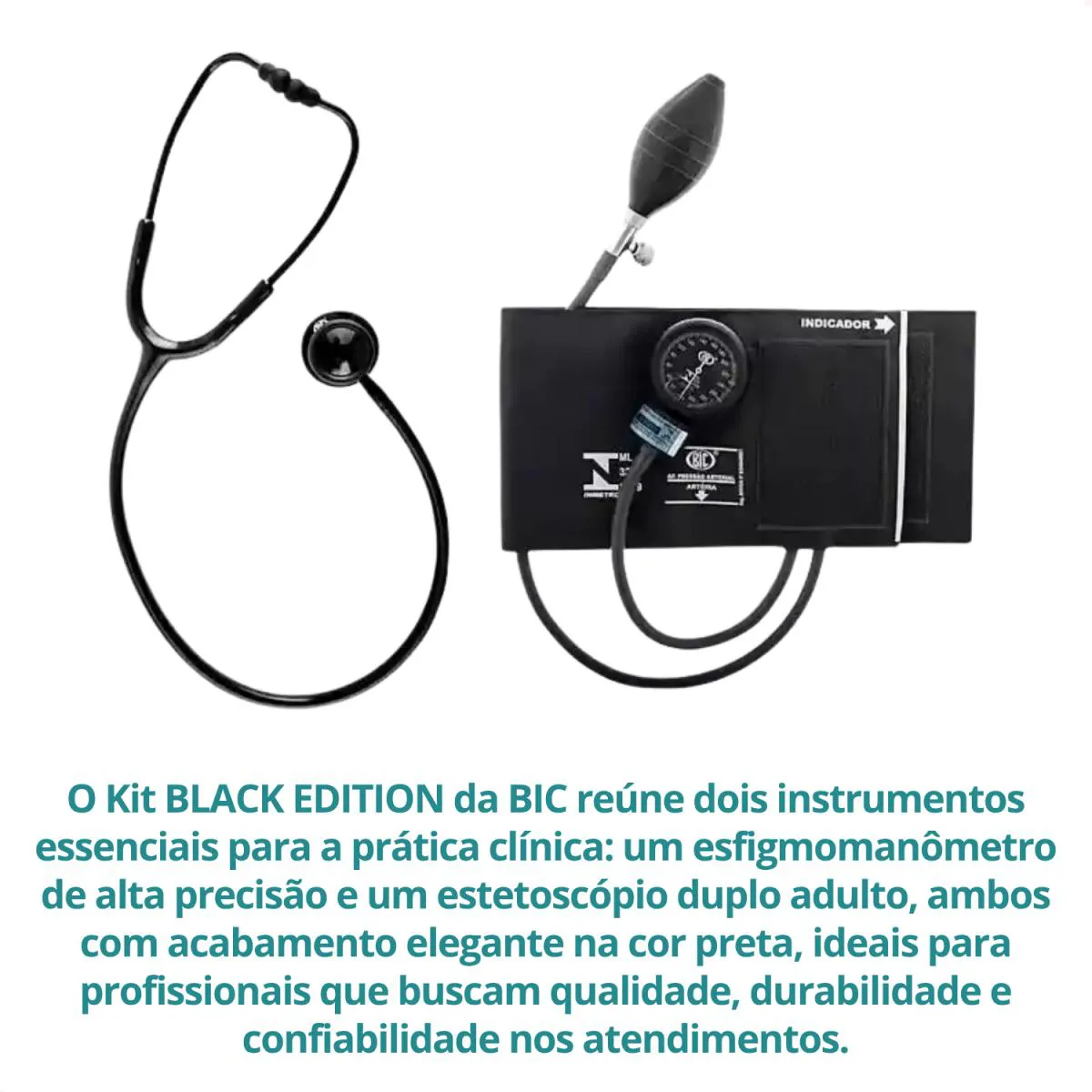 O Kit BLACK EDITION da BIC reúne dois instrumentos essenciais para a prática clínica: um esfigmomanômetro de alta precisão e um estetoscópio duplo adulto, ambos com acabamento elegante na cor preta, ideais para profissionais que buscam qualidade, durabilidade e confiabilidade nos atendimentos.