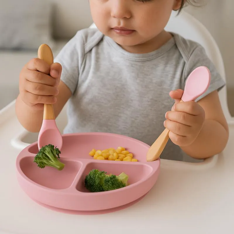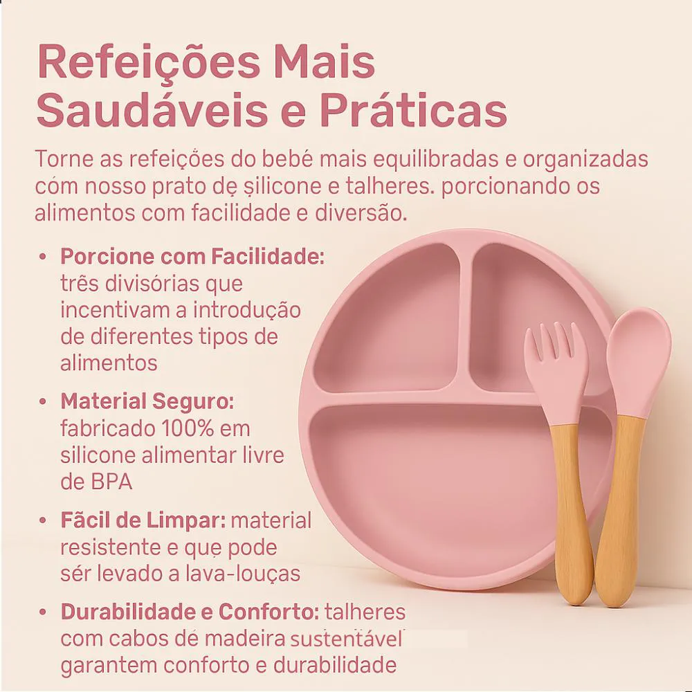 Conjunto Refeição Infantil Silicone 3 Peças Prato com Divisórias + Colher Garfo Treinamento do Bebê Antiderrapante Rosa