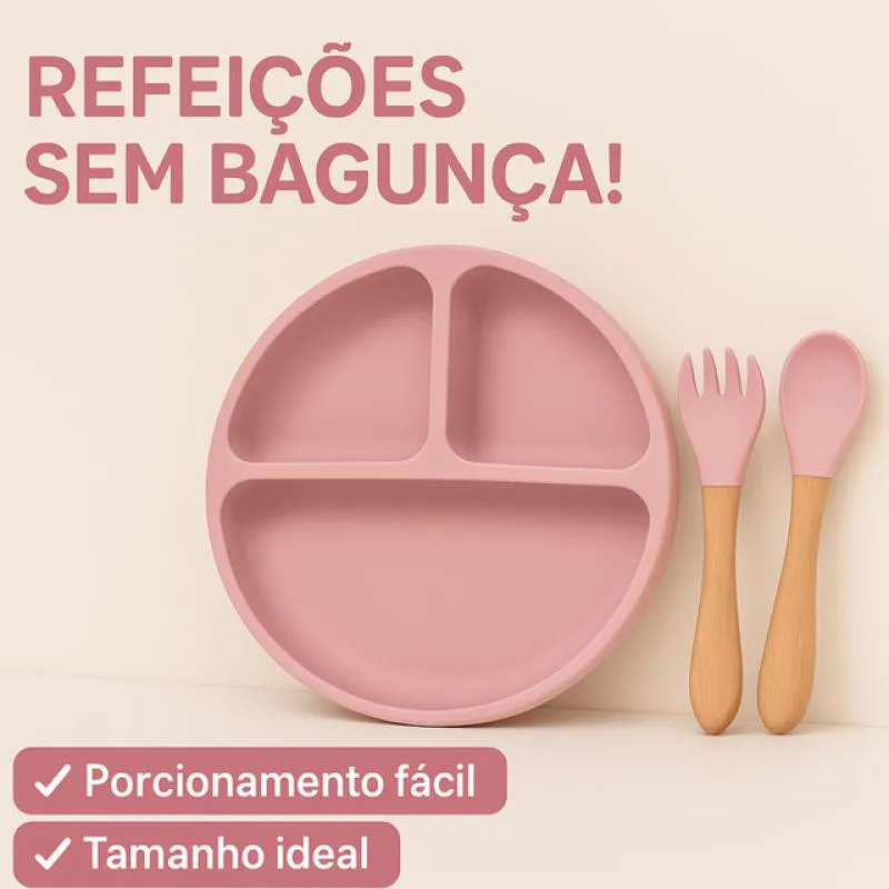 Prato infantil com Divisórias + Talheres em Silicone e Bambu – Antiderrapante, Seguro e Charmoso Transforme as refeições do seu bebê em momentos mais alegres e seguros com o Prato Infantil com Divisórias e Talheres. Feito com silicone alimentar livre de BPA e cabos de bambu natural, é perfeito para incentivar a alimentação independente, com praticidade e estilo. Benefícios do Produto: Antiderrapante: base com ventosa que adere à mesa, evitando quedas e bagunça. Material Seguro: 100% atóxico, livre de BPA, PVC e ftalatos. Design Inteligente: 3 divisórias ideais para separar os alimentos e estimular a autonomia do bebê. Talheres Ergonômicos: colheres e garfos com cabos de bambu e pontas de silicone macio, perfeitos para mãos pequenas. Resistente e Fácil de Limpar: pode ir à lava-louças e suportar altas temperaturas. Ideal Para: Bebês e crianças em fase de introdução alimentar (BLW), garantindo conforto, segurança e aprendizado durante as refeições. Especificações Técnicas: Material: Silicone grau alimentício + bambu natural Tamanho do prato: aprox. 20 cm de diâmetro Indicado para: 6 meses + Item incluso: 1 Prato com divisórias 1 Colher de silicone e bambu 1 Garfo de silicone e bambu