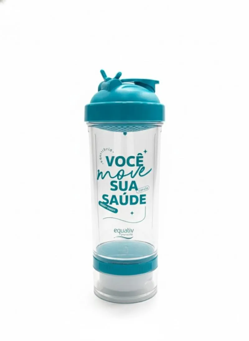 Shaker Inteligente Equativ: O Acessório Essencial para o Seu Foco na saúde! Diga adeus aos shakes empelotados e à bagunça de carregar potes separados! O Shaker Equativ foi desenhado para quem leva a sério a praticidade e a saúde. Com um design moderno na cor azul-turquesa, ele é mais do que uma garrafa: é uma solução completa para a sua rotina fitness.Seu maior diferencial é o compartimento inferior rosqueável e vedado. Use-o para armazenar sua dose extra de Whey Protein, BCAA, Creatina ou até mesmo suas cápsulas e vitaminas. Mantenha seus suplementos secos e prontos para o consumo, onde e quando precisar.A garrafa possui marcações de volume para facilitar a dosagem e uma tela misturadora eficiente que garante um shake perfeitamente homogêneo, sem grumos. Leve seu equilíbrio para a academia, o trabalho ou viagens com total segurança e estilo!