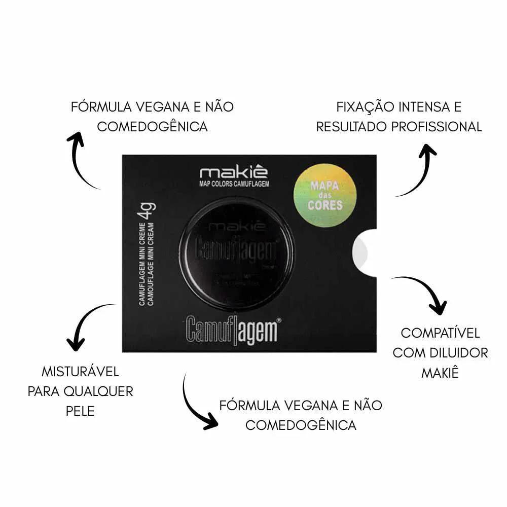 O Corretivo Facial Makiê Mini Camuflagem Creme Mapa das Cores é um produto de maquiagem desenvolvido especialmente para proporcionar cobertura perfeita em diferentes graus de complexidade.