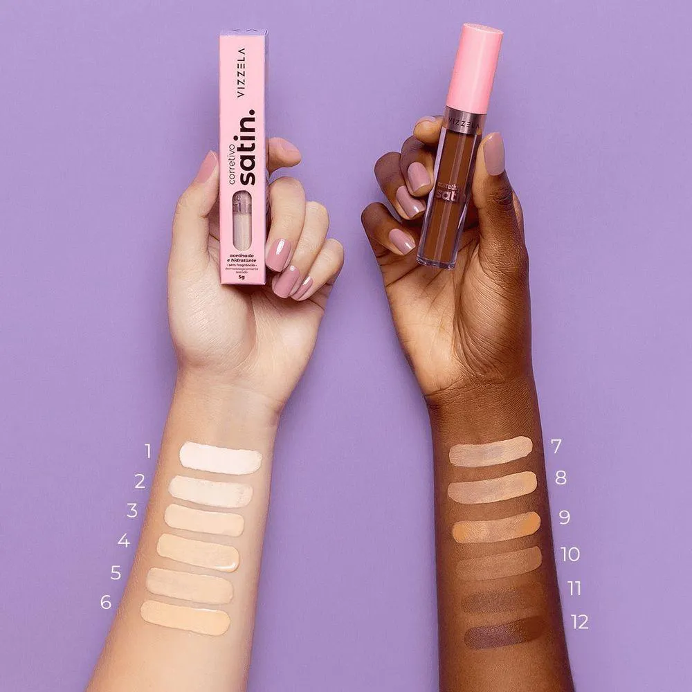 O corretivo Satin possui um acabamento acetinado com alta cobertura, deixando a pele com um toque de radiancia devido ao ativo Gatuline Radiance®, além da hidratação instantânea promovida pela combinação de ácido hialurônico e biosacarídeo. E a rosa mosqueta que auxilia no tratamento das olheiras.
