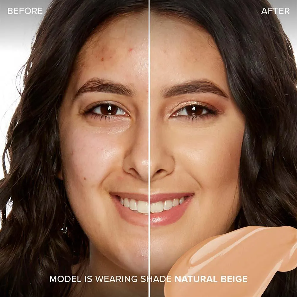 Para retocar e ocultar a hiperpigmentação ou tom de pele irregular: coloque um ponto diretamente na area de tom irregular e misture na pele com os dedos, pincel de corretivo ou esponja do tipo Beauty Blender em um movimento de pressão (pontilhado) até ficar perfeito.
