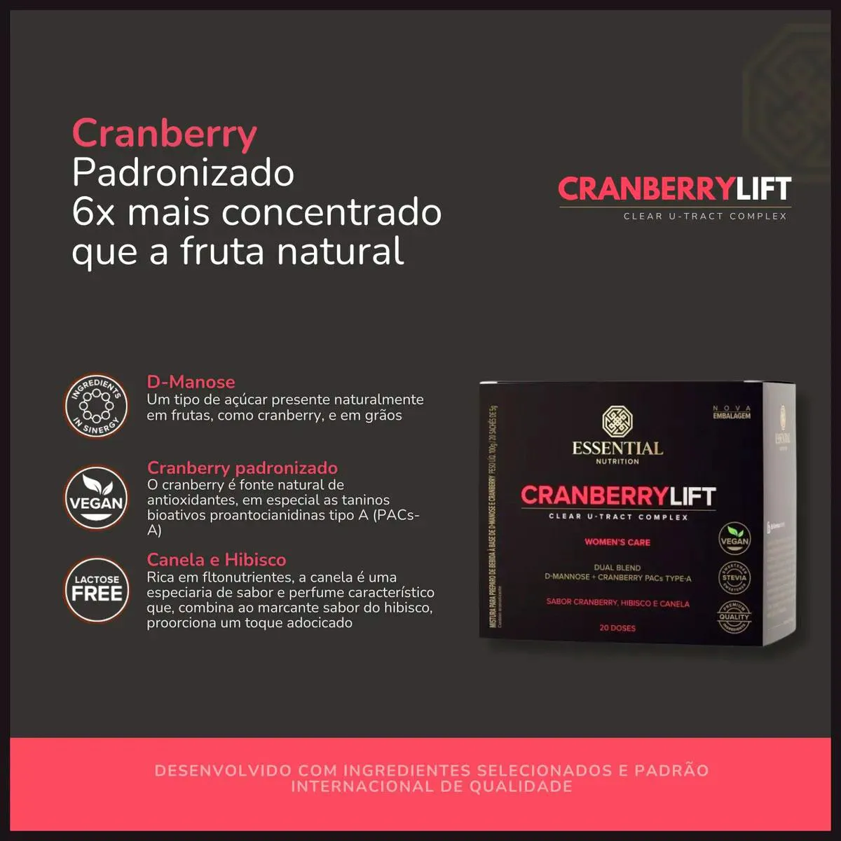 Cranberrylift é um daqueles produtos que provavelmente seu médico ou sua melhor amiga vão te recomendar. Sua fórmula traz o Cranberry Americano, fonte de proantocianidinas tipo A (PACs-A) e D-manose. Com o verão chegando, Cranberrylift vai muito bem com praia o dia todo e aquela sensação de liberdade. O QUE É CRANBERRYLIFT? Cranberrylift é a combinação da tradicional fruta norte-americana cranberry, fonte de proantocianidinas tipo A (PACs-A), ao gliconutriente bioativo D-manose e aos sabores marcantes da canela e do hibisco. O QUE CONTÊM? Cranberry Padronizado - Fonte de proantocianidinas tipo A (PACs-A) D-manose (Gliconutriente bioativo) Adoçante natural Ingredientes veganos Componentes ricos em antioxidantes e fitonutrientes Cranberry em Pó 6x mais concentrado que a fruta in natura O QUE NÃO CONTÊM? adoçantes artificiais Conservantes Lactose Glúten Corantes Aromas artificiais OS INGREDIENTES CRANBERRY: Muito conhecida e apreciada nos Estados Unidos (maior produtor mundial), o cranberry é uma fruta nativa da América do Norte (Vaccinium macrocarpon) fonte natural de antioxidantes, em especial os taninos bioativos proantocianidinas tipo A (PACs-A). D-MANOSE: Gliconutriente bioativo que ocorre naturalmente em frutas, como o cranberry, amora, maçã e pêssego, em vegetais, como brócolis e berinjela, e em grãos como o feijão, feno-grego, e que também é produzido pelo corpo humano. CANELA E HIBISCO: Rica em fitonutrientes, a canela é uma especiaria de sabor e perfume característicos que, combinada ao marcante sabor do hibisco, proporciona um toque adocicado. COMO UTILIZAR? Adicione 5g (1 sachê) em aproximadamente 200ml (1 copo) de água gelada ou quente e misture até a total homogeneização. Beba imediatamente após o preparo. INGREDIENTES D-manose, cranberry em pó, fosfato tricálcico, canela em pó, aroma natural de hibisco, edulcorante estévia. NÃO CONTÉM GLÚTEN.