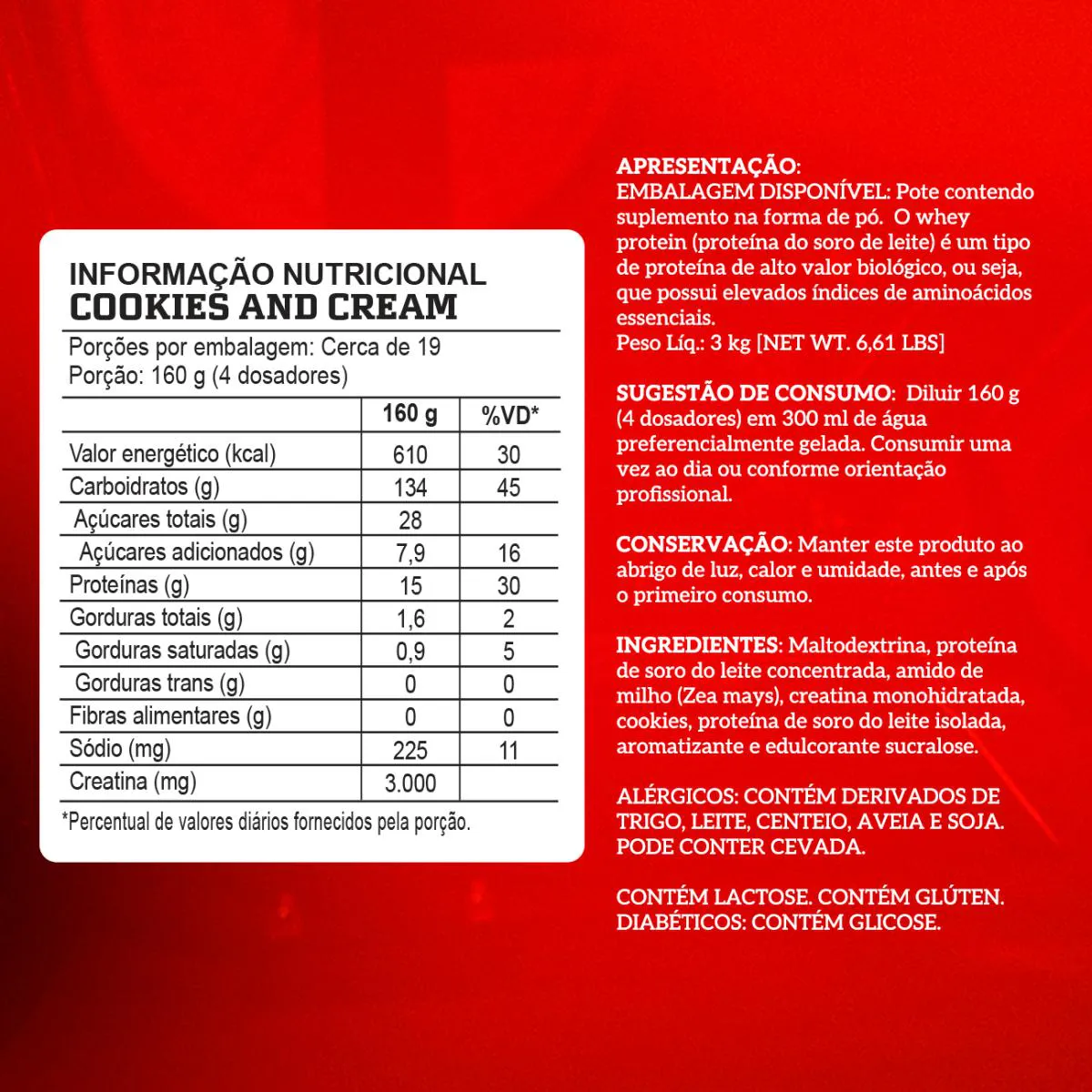 Além de uma combinação inteligente de duas proteínas de alto valor biológico (whey protein concentrado e whey protein isolado), a fórmula também oferta creatina (3 g por porção), composto relacionado à explosão muscular, necessária durante os treinos, e também ao aumento de massa muscular.