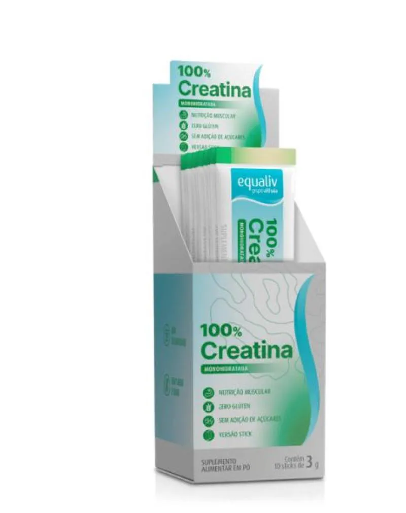 Creatina Monohidratada Equaliv auxilia no aumento do desempenho físico durante exercícios repetidos de curta duração e alta intensidade (musculação, crossfit, funcional, futebol, entre outros). Quando o exercício físico é levado à exaustão, a quantidade de creatina no músculo diminui, assim como a produção de energia, comprometendo a continuação do eficiente trabalho muscular. Creatina Equaliv contribui para o aumento da força e ganho muscular, aumentando a resistência física.MODO DE USAR: Adicionar 3,0 g (1 stick) para cada 200 ml de água até a total homogeneização. Consumir logo após o preparo e de preferência antes da atividade física, ou conforme orientação profissional. USO ADULTO.INGREDIENTES: Creatina monohidratada.contém 10 sticks de 3 g