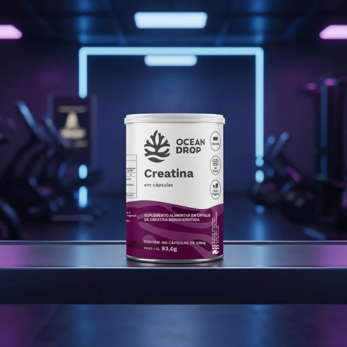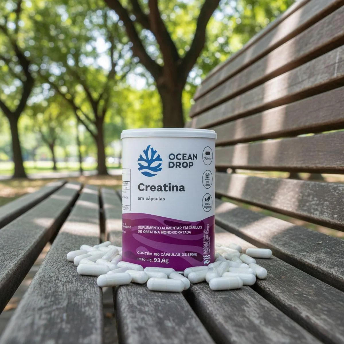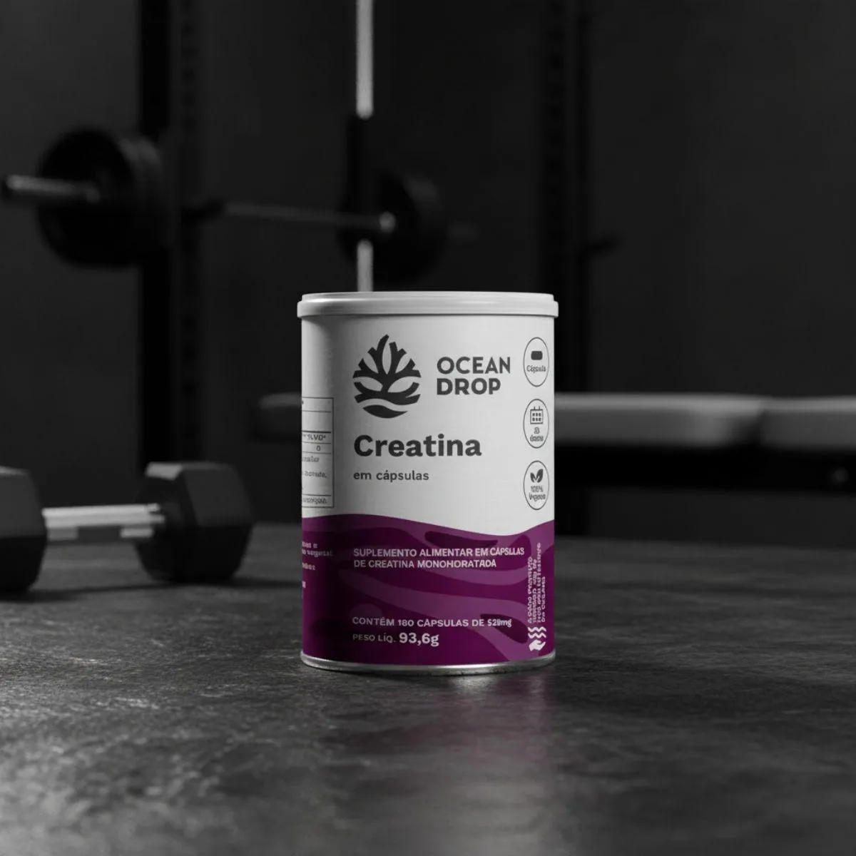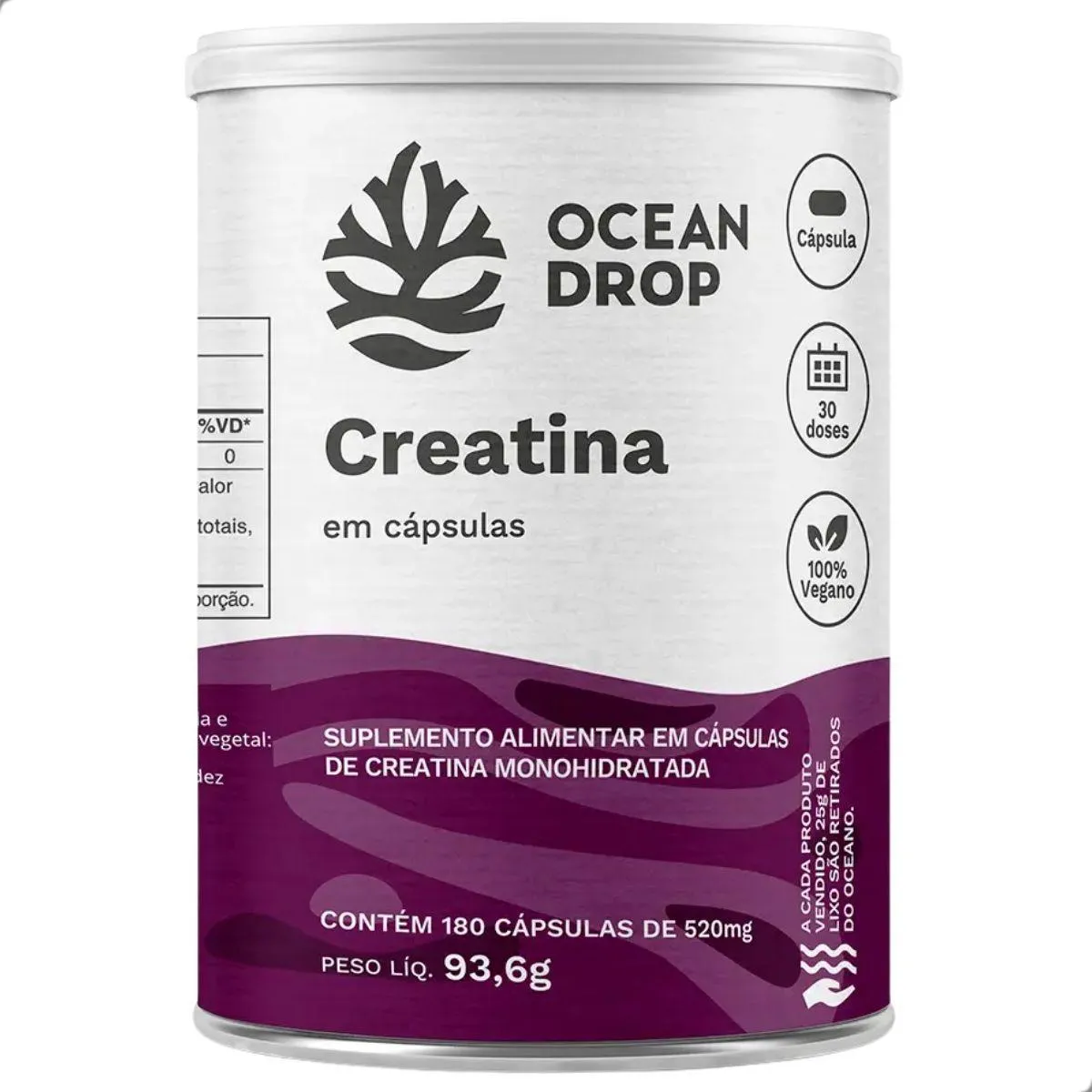 A Creatina 100% Monohidratada é um suplemento nutricional em formato de cápsulas, composto por creatina monohidratada pura, sem aditivos artificiais. Apresentado em frasco com 180 cápsulas, o produto segue o conceito de clean label da marca Ocean Drop.