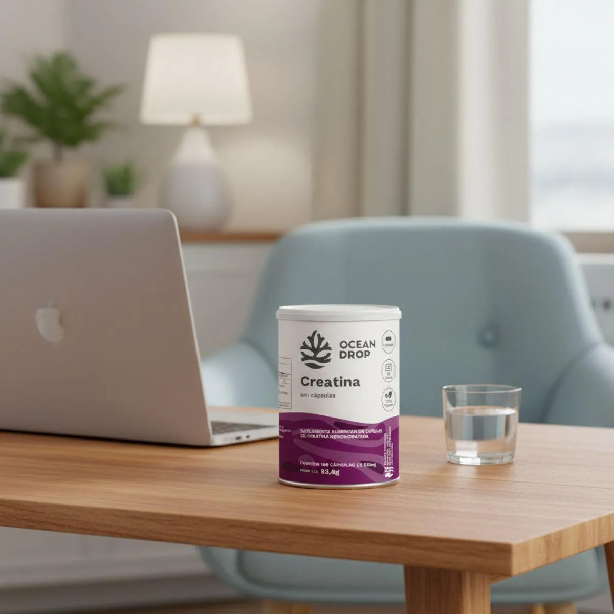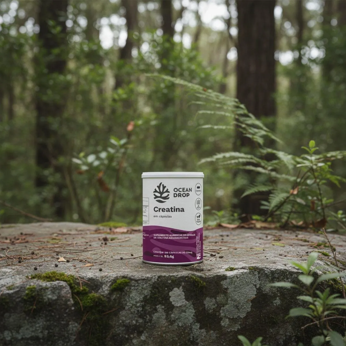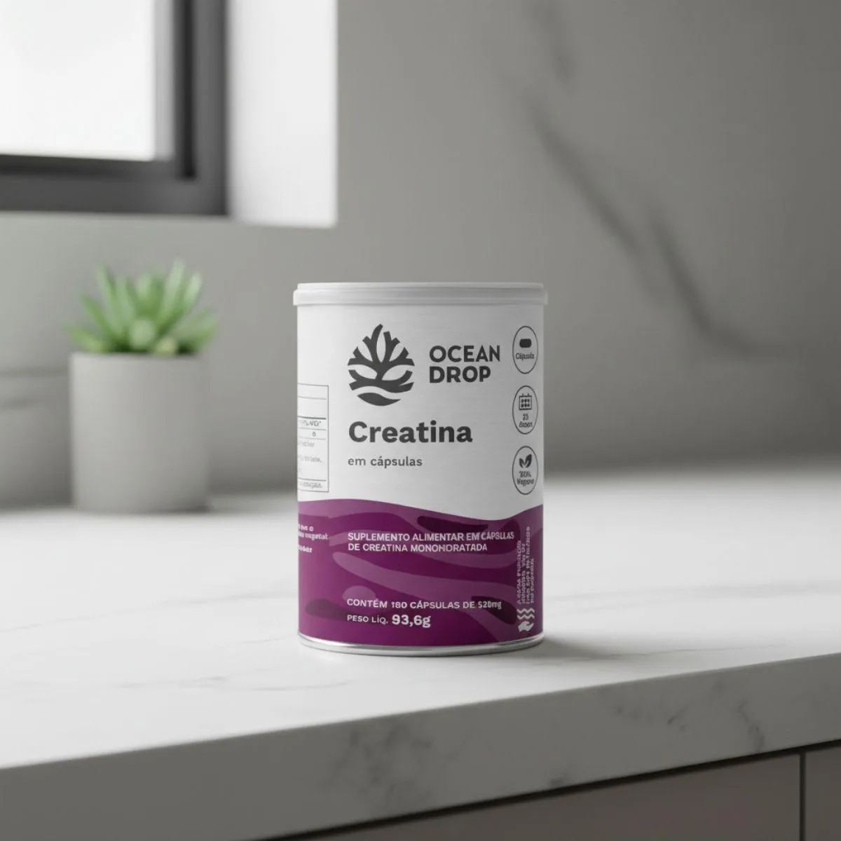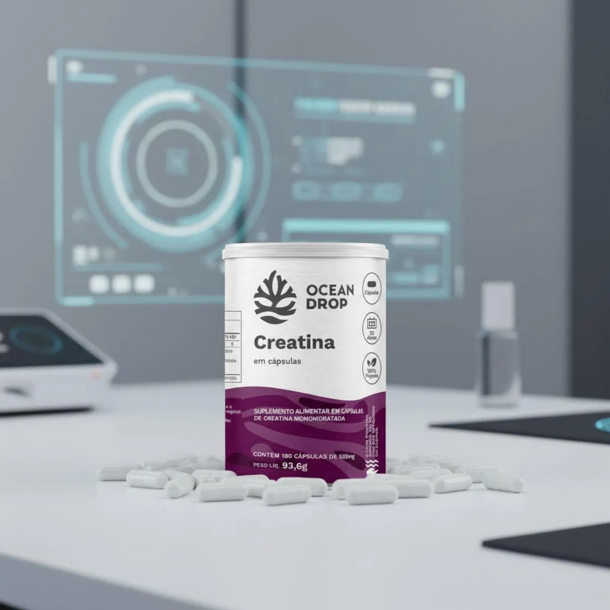 A Creatina 100% Monohidratada é um suplemento nutricional em formato de cápsulas, composto por creatina monohidratada pura, sem aditivos artificiais. Apresentado em frasco com 180 cápsulas, o produto segue o conceito de clean label da marca Ocean Drop.