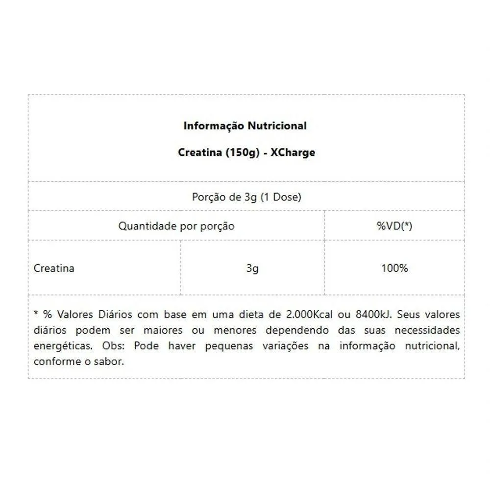 Informação Nutricional Creatina (150g) - XChargePorção de 3g (1 Dose)Quantidade por porção%VD(*)Creatina3g100%* % Valores Diários com base em uma dieta de 2.000Kcal ou 8400kJ. Seus valores diários podem ser maiores ou menores dependendo das suas necessidades energéticas. Obs: Pode haver pequenas variações na informação nutricional, conforme o sabor.
