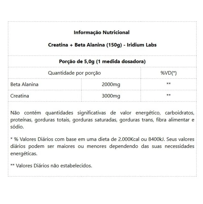 Creatina + Beta Alanina (150g) --* A combinação perfeita para quem busca aumento de força e performance por períodos prolongados. Creatina + Beta Alanina é a combinação de aminoácidos perfeita para quem busca aumento de força e resistência muscular para elevar sua performance ao próximo nível. Esses aminoácidos agem em sinergia, auxiliando no aumento da força e redução da fadiga muscular, principalmente para exercícios de alta intensidade, além de auxiliar na síntese proteica, favorecendo o ganho de massa muscular. A Creatina é o suplemento mais indicado na ciência para o aumento da força e hipertrofia, isso porque ela atua como fonte de energia rápida para os músculos, em exercícios curtos e intensos, ou seja, sua função é crucial em treinos com muita carga e esforço. Ela fornece substrato para regenerar o ATP, molécula de energia muscular, permitindo treinos mais intensos e com maior volume. Já a Beta Alanina, eleva os níveis de Carnosina intramuscular, uma substância que modula o pH das células musculares, combatendo a acidose e adiando a fadiga muscular. Isso melhora o desempenho físico proporcionando um aumento da resistência muscular e treinos mais longos e intensos. Benefícios: - 3g de creatina por dose;- 2g de beta alanina por dose;- Melhora a performance em exercícios de alta intensidade;- Promove o aumento da força e massa magra;- Previne a fadiga e aumenta a resistência muscular.