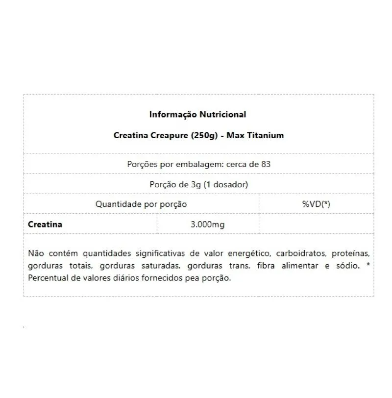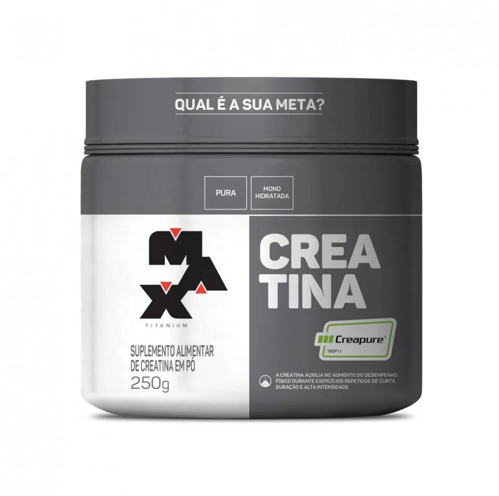 Creatina Creapure (250g) Descubra a excelência da creatina com a Max Titanium, agora com a pureza e concentração garantidas pela exclusiva tecnologia alemã Creapure®. A creatina é essencial para melhorar o desempenho físico em exercícios repetidos de curta duração e alta intensidade. Além disso, ela auxilia no complemento dos estoques endógenos de creatina, potencializando seus treinos e resultados. Benefícios: - Aumento do desempenho físico;- Maior força muscular;- Recuperação rápida;- Monohidratada;- Pura.