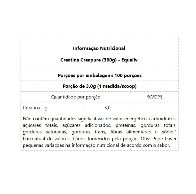 Creatina Creapure (300g) Equaliv Creatina é um aminoácido de metabolização rápida, vegano e com tecnologia Creapure® (creatina monohidratada, de alta tecnologia e pureza). A creatina auxilia no aumento do desempenho físico durante exercícios repetidos de curta duração e alta intensidade. Quando o exercício físico é levado até a exaustão, a quantidade de creatina no músculo diminui, assim como a produção de energia, comprometendo a continuação do eficiente trabalho muscular. Equaliv Creatina contribui para o aumento da força e ganho de massa muscular, aumentando a resistência física. Benefícios: - Tecnologia Alemã;- 100% Creatina Pura Monohidratada;- Glúten e Carbo Free;- Vegano;- Auxilia no aumento da força e resistência física;- Contribui para o ganho de massa muscular;- Melhora o desempenho durante exercícios de alta intensidade e curta duração.