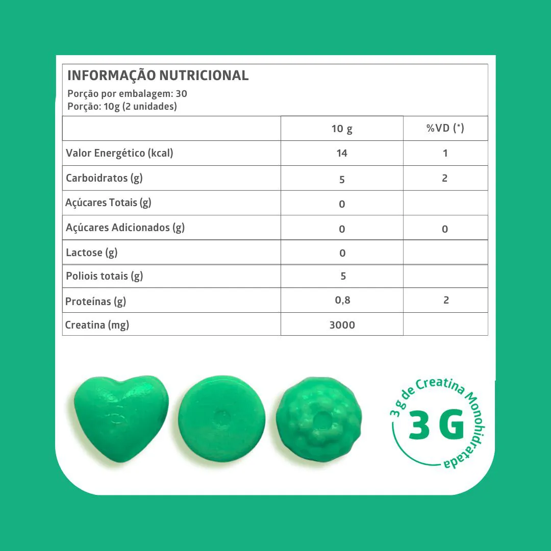 Com um delicioso sabor de maçã verde, cada porção de 2 gomas fornece 3g de creatina, a dose ideal para manter os estoques do corpo e apoiar seu desempenho nos treinos.
