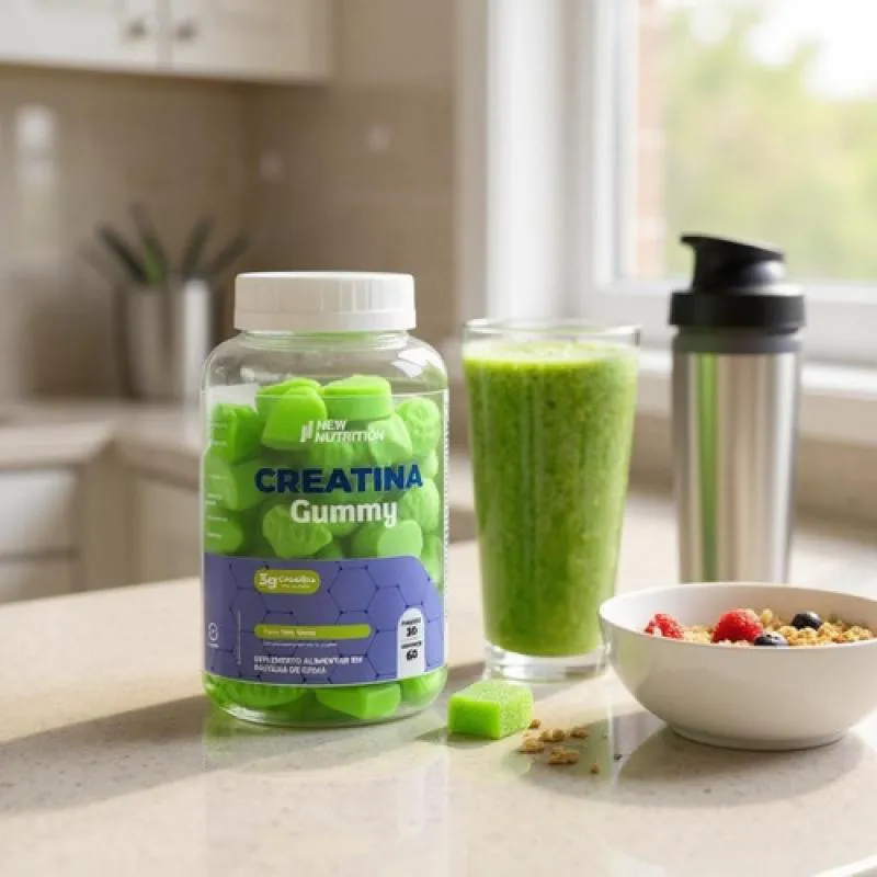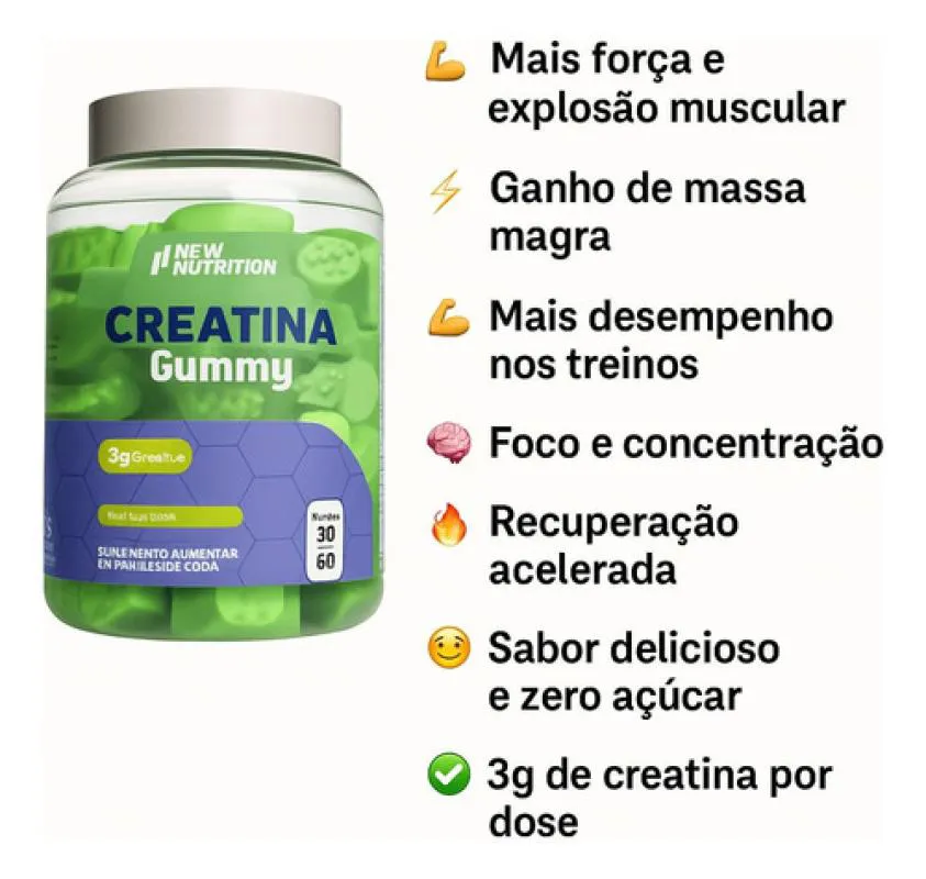 A Creatina Gummy da New Nutrition é a combinação perfeita entre performance, praticidade e sabor. Desenvolvida em formato de goma mastigável, oferece 3g de creatina monohidratada por porção (2 gomas), sendo uma alternativa deliciosa para quem busca melhores resultados nos treinos sem abrir mão da comodidade.