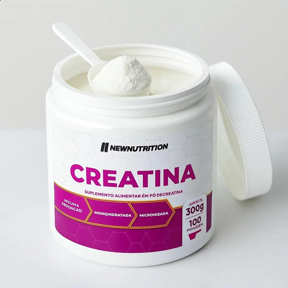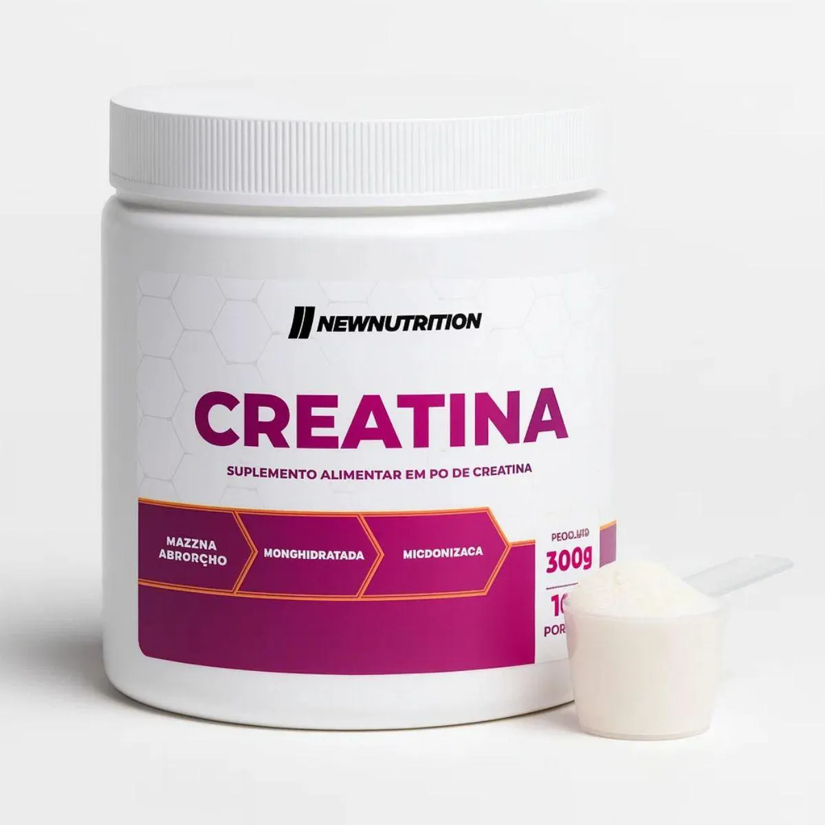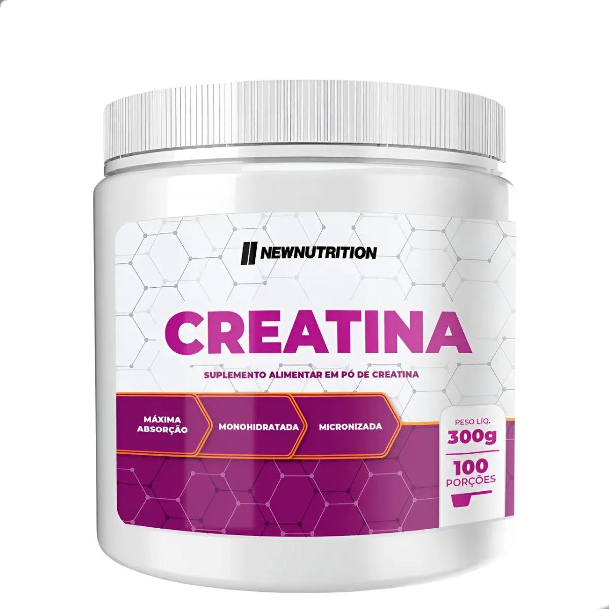 Creatina Monohidratada 300g New Nutrition pote de 300 g de creatina monohidratada, ideal para quem busca praticidade e pureza.