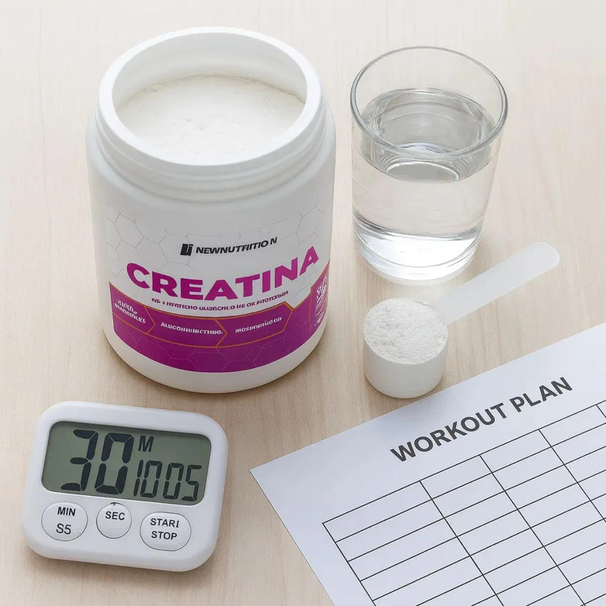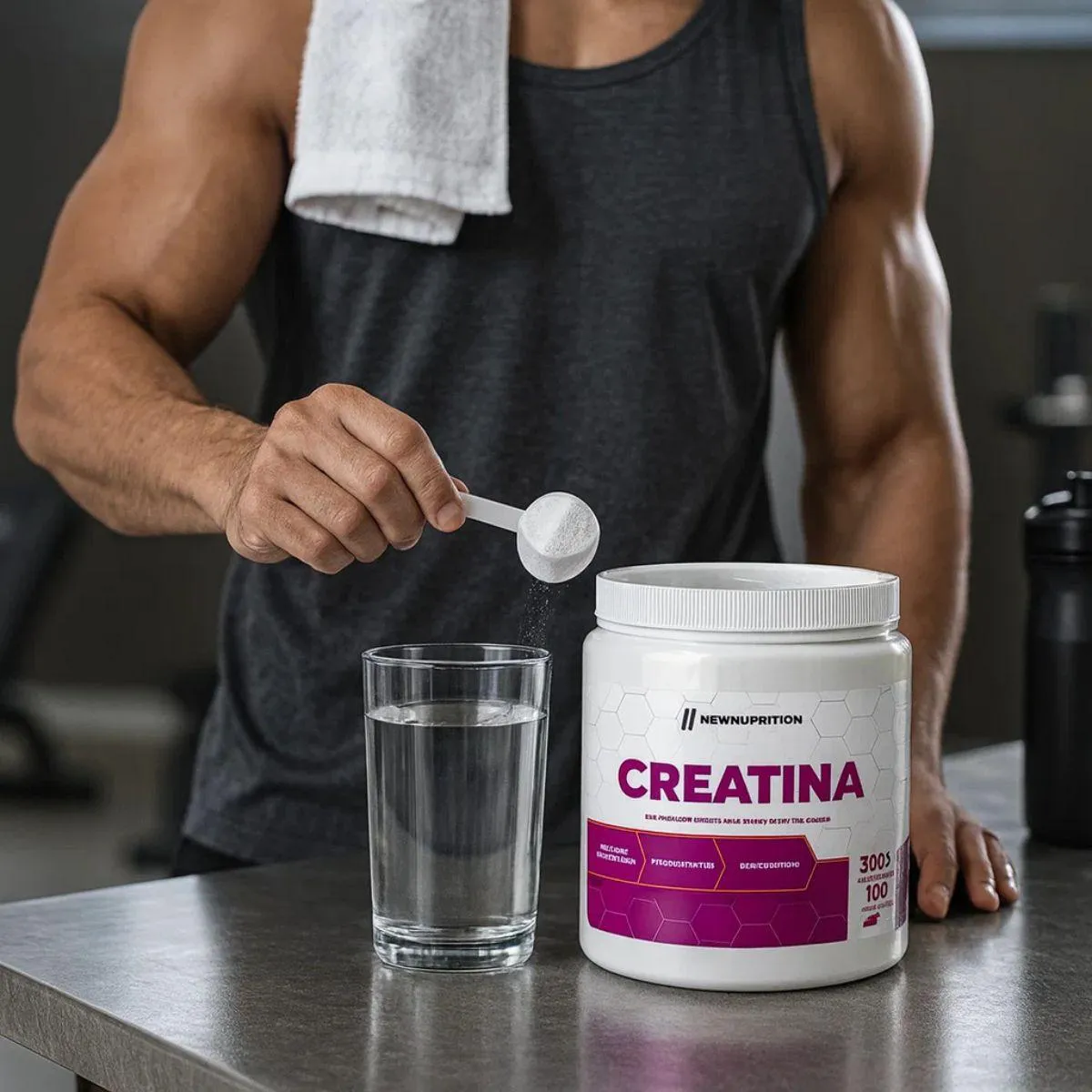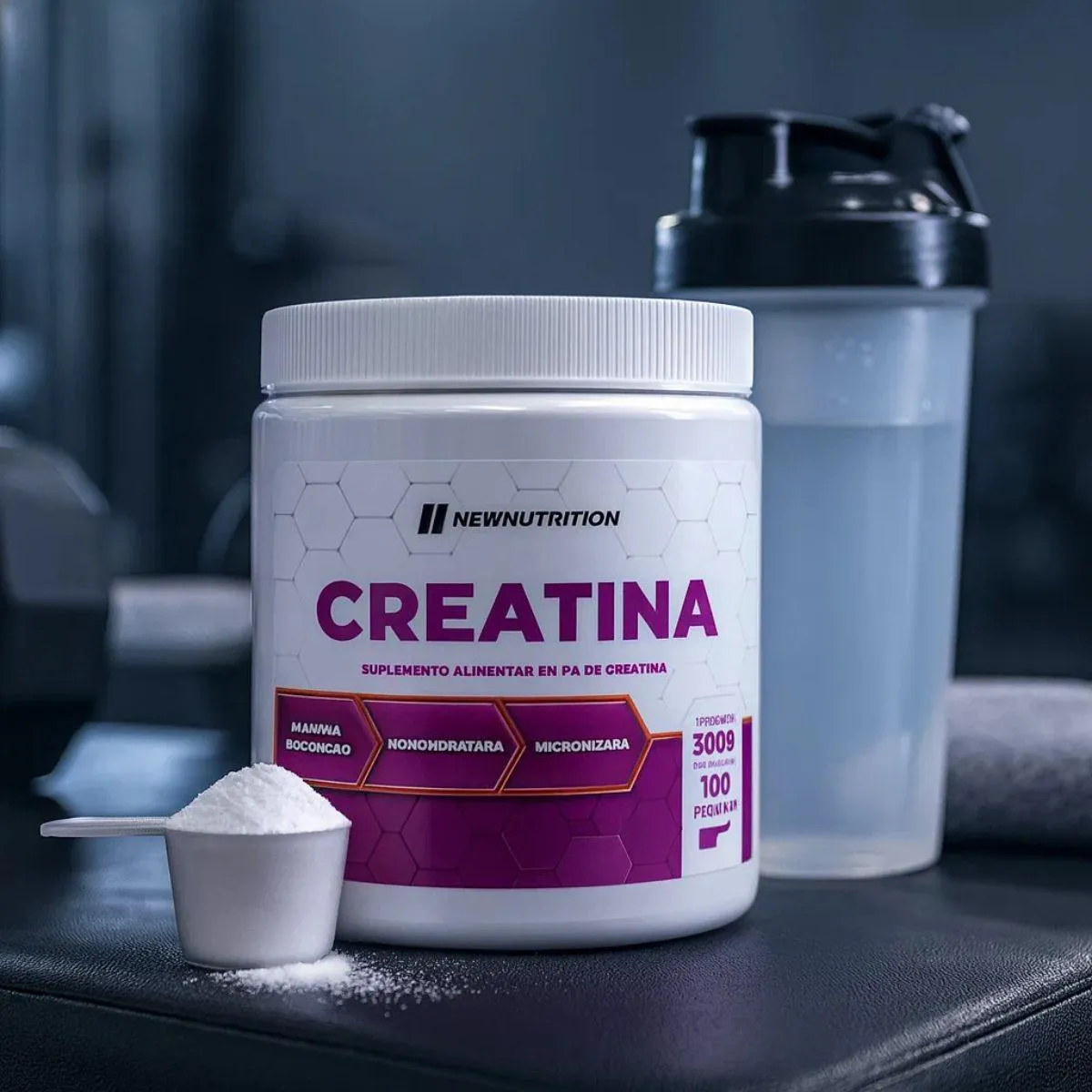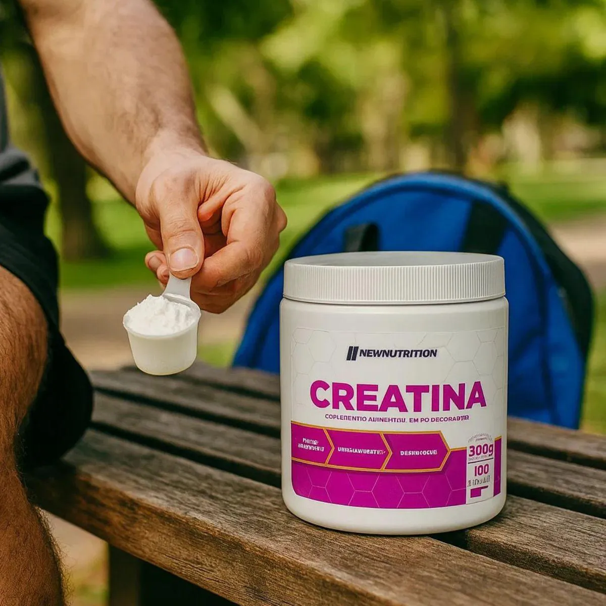 Creatina Monohidratada 300g New Nutrition pote de 300 g de creatina monohidratada, ideal para quem busca praticidade e pureza.