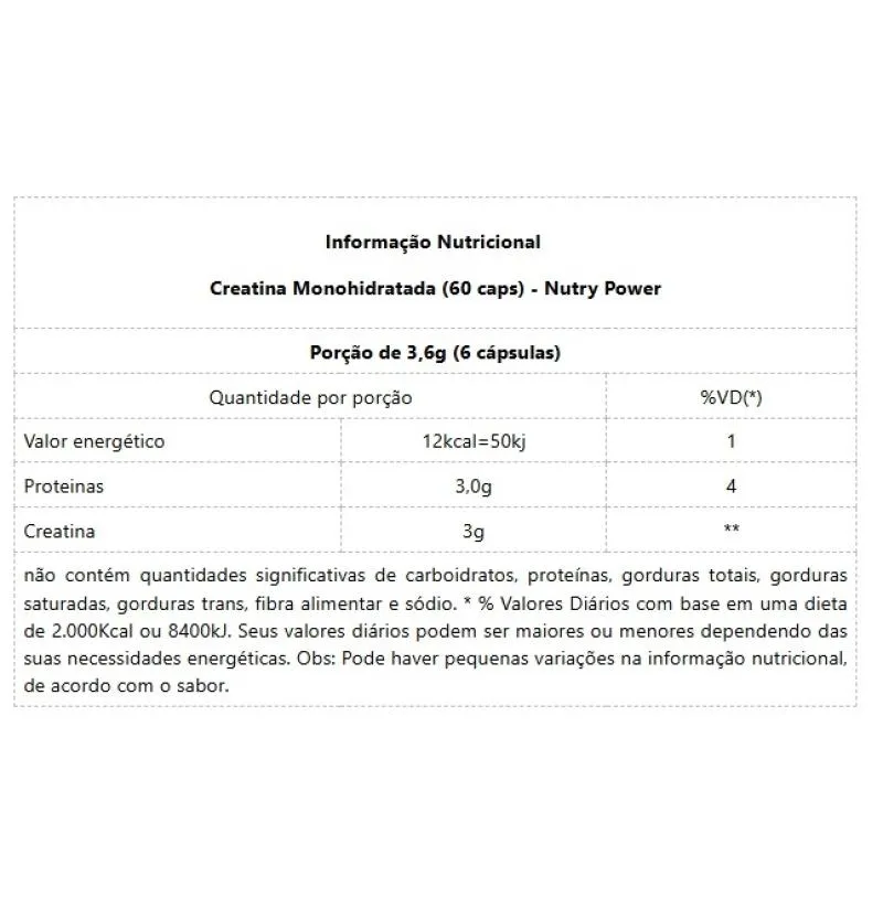 CREATINA - NUTRY POWER A creatina é um aminoácido, que tem como função importante fornecer energia para a contração muscular. Além disso, a creatina pode melhorar o desempenho dos atletas em atividades que requerem explosões, como em corridas. Ocorre aumento da massa muscular pela retenção de líquidos (característica da creatina).CREATINA MONOHIDRATADA Formada a partir da associação de três aminoácidos de alto valor biológico: arginina, glicina e metionina e está presente naturalmente em nosso organismo, onde cerca de 95% do conteúdo de creatina é armazenada no músculo esquelético. Ela exerce um papel importante na contração muscular, servindo como uma reserva de energia em atividades físicas de curta duração, alta intensidade e com curtos períodos de recuperação, melhorando a resposta fisiológica e aumentando a produção de força máxima. A Creatina possui efeito cientificamente comprovado sobre o ganho de massa magra e aumento de força e potência muscular, desde que seu consumo esteja associado a um programa de exercícios com os mesmos objetivos. Recomenda-se a ingestão desta substância juntamente com um carboidrato de alto índice glicêmico para facilitar o seu transporte para dentro da célula muscular. BENEFÍCIOS: - Explosão Muscular;- Aumento do ATP muscular;- Retarda fadiga muscular;- Ajuda na manutenção da hipertrofia.