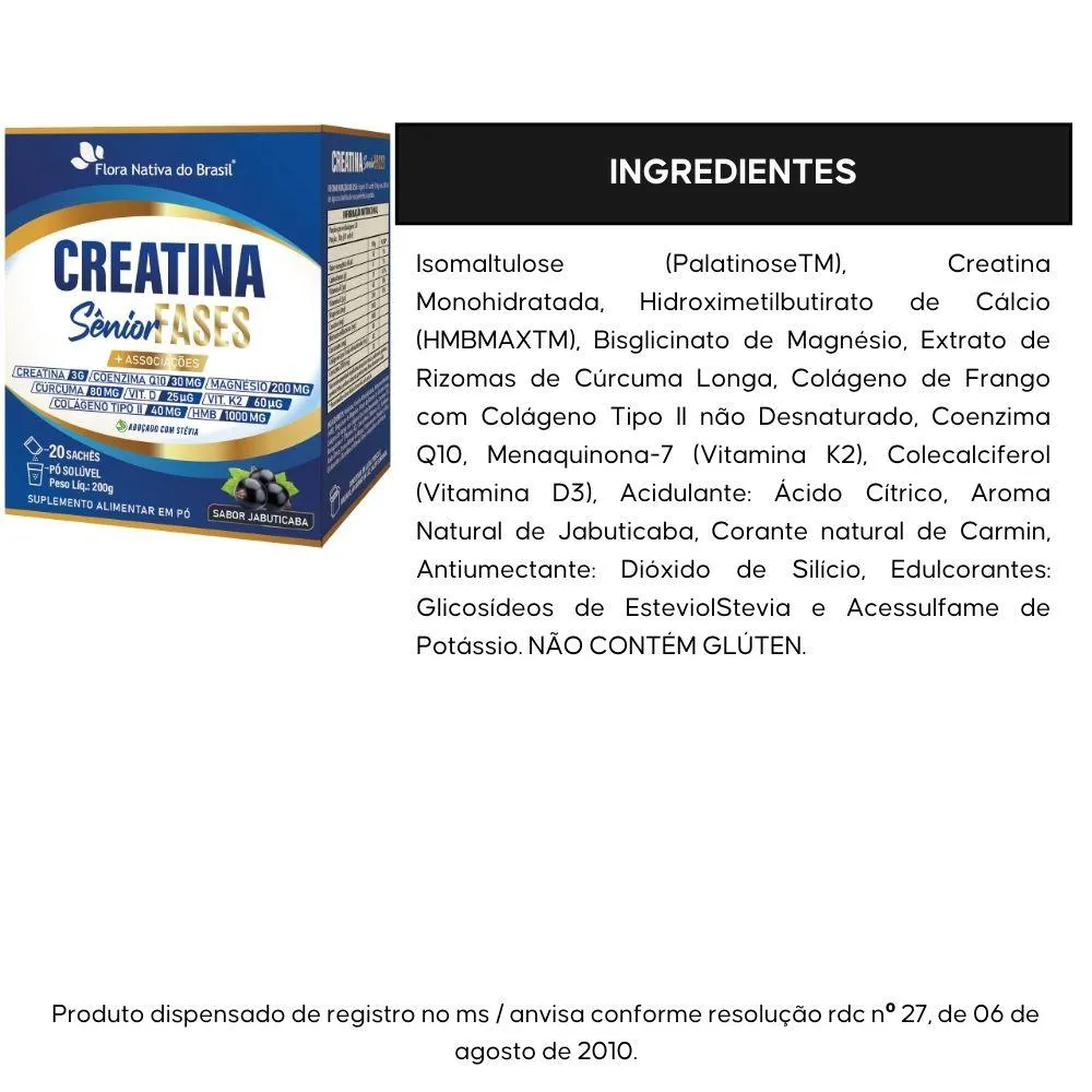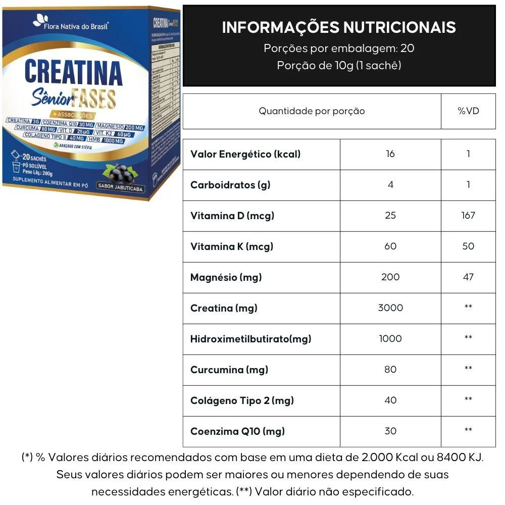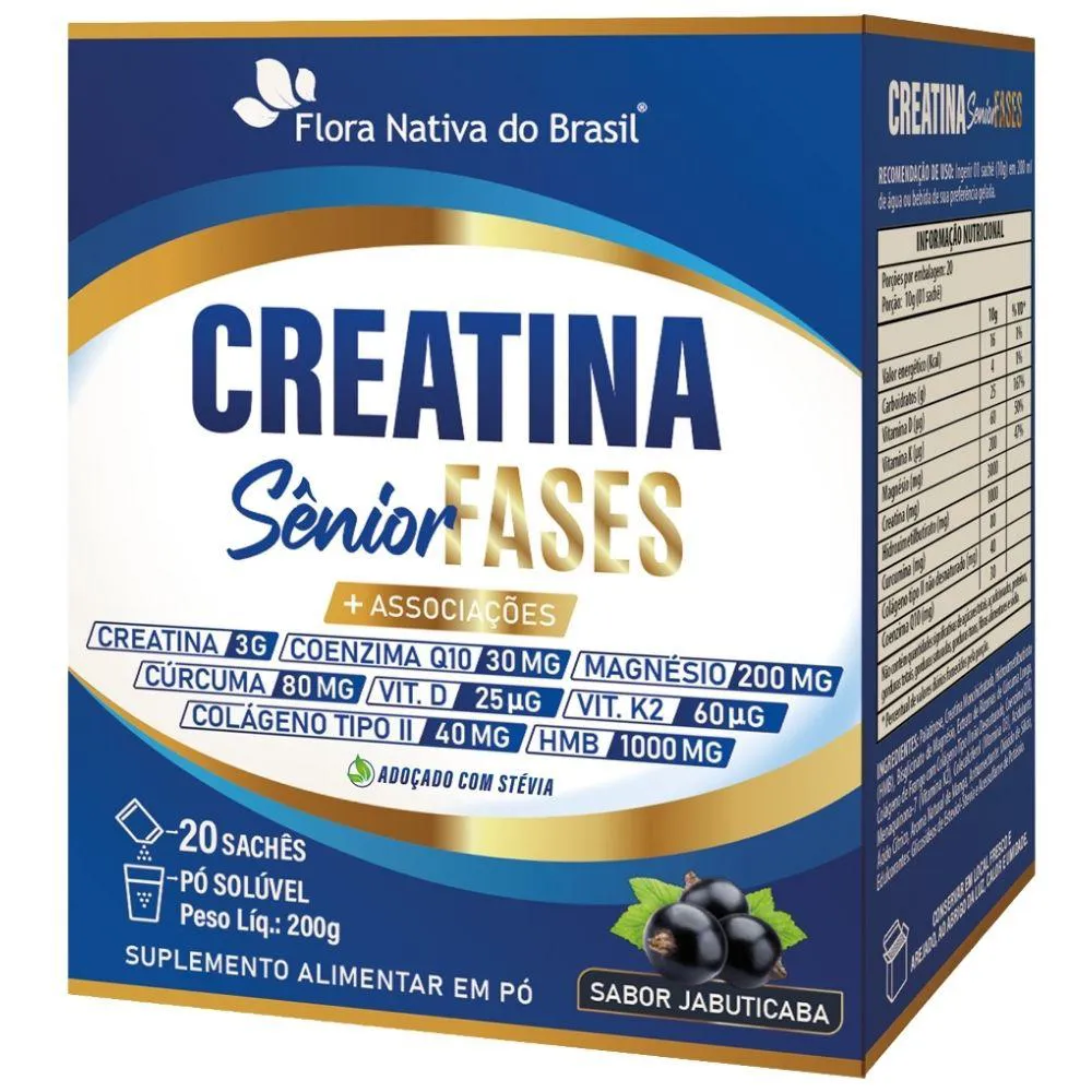 Creatina Sênior Fases (Colágeno Tipo 2, Vit D3+K2, Magnésio, Q10, Hmb E Cúrcuma) 20 Sachês - Flora Nativa