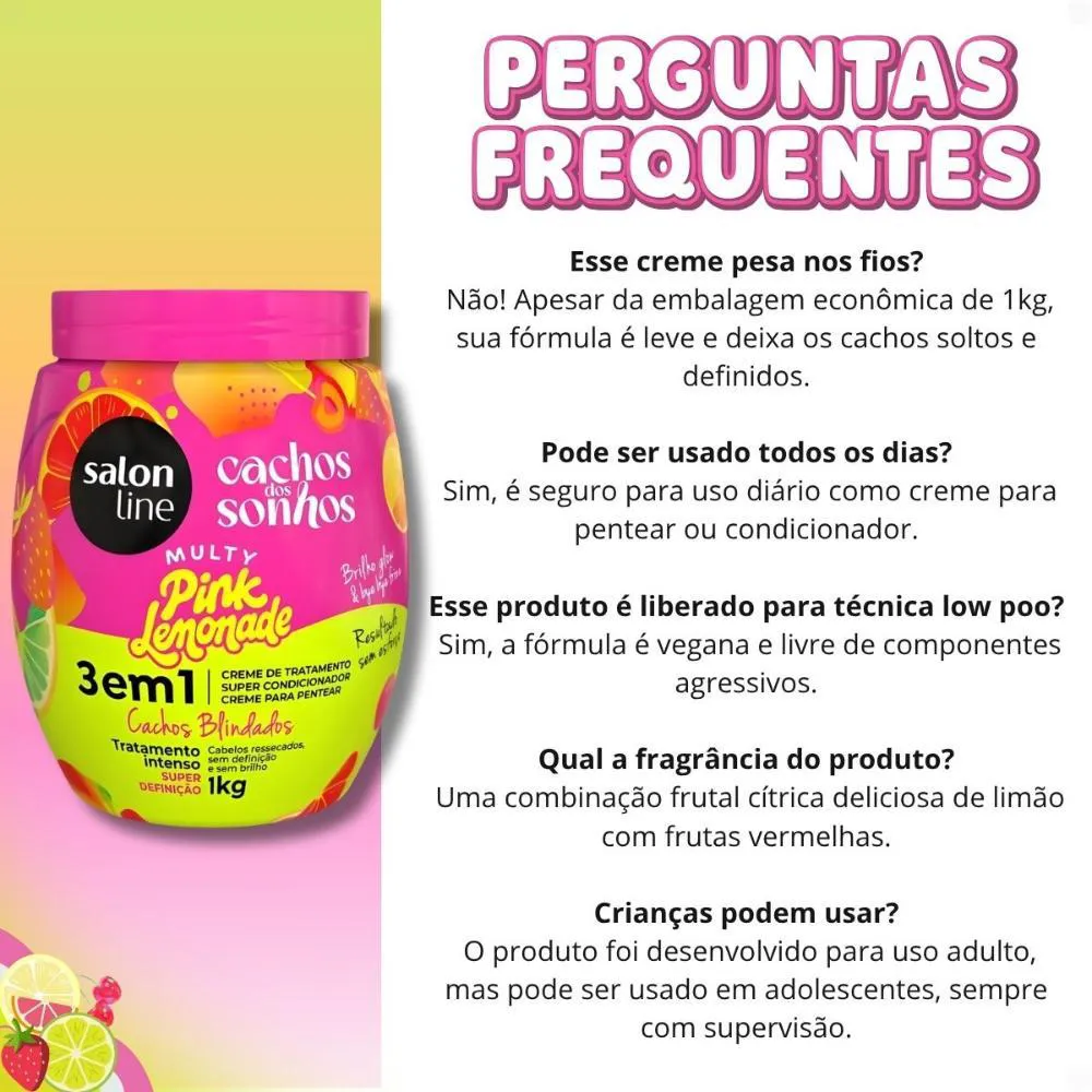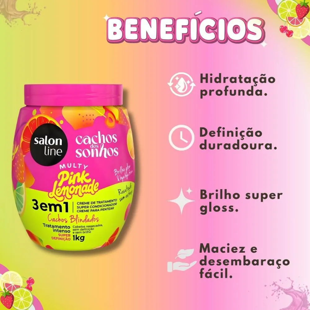 Descubra o poder transformador do Creme Capilar 3 Em 1 Salon Line Multy Pink Lemonade Cachos Dos Sonhos 1kg, a solução ideal para quem busca cachos perfeitamente definidos, hidratados e livres de frizz. Este produto inovador da Salon Line foi especialmente desenvolvido para atender às necessidades de cabelos ondulados, cacheados e crespos que sofrem com ressecamento, falta de definição e brilho.Com sua fórmula multifuncional 3 em 1, o Multy Pink Lemonade Cachos Dos Sonhos atua como creme de tratamento intenso, super condicionador e creme para pentear, proporcionando uma rotina de cuidados completa. Ele oferece tratamento intenso que blinda os cachos contra o frizz e garante um brilho glow radiante, resultando em hidratação profunda, controle do frizz e super definição para seus cachos dos sonhos.Benefícios Principais