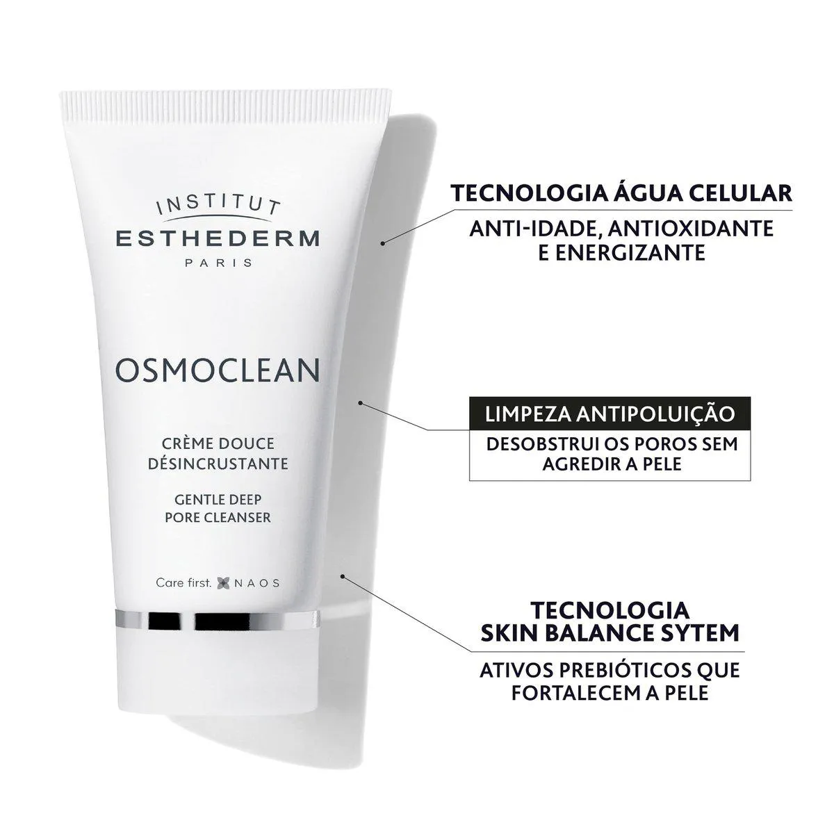 E mais: o Instituto Esthederm traz também a Tecnologia Osmoclean, que equilibra o ecossistema da pele e a protege contra partículas de poluição.