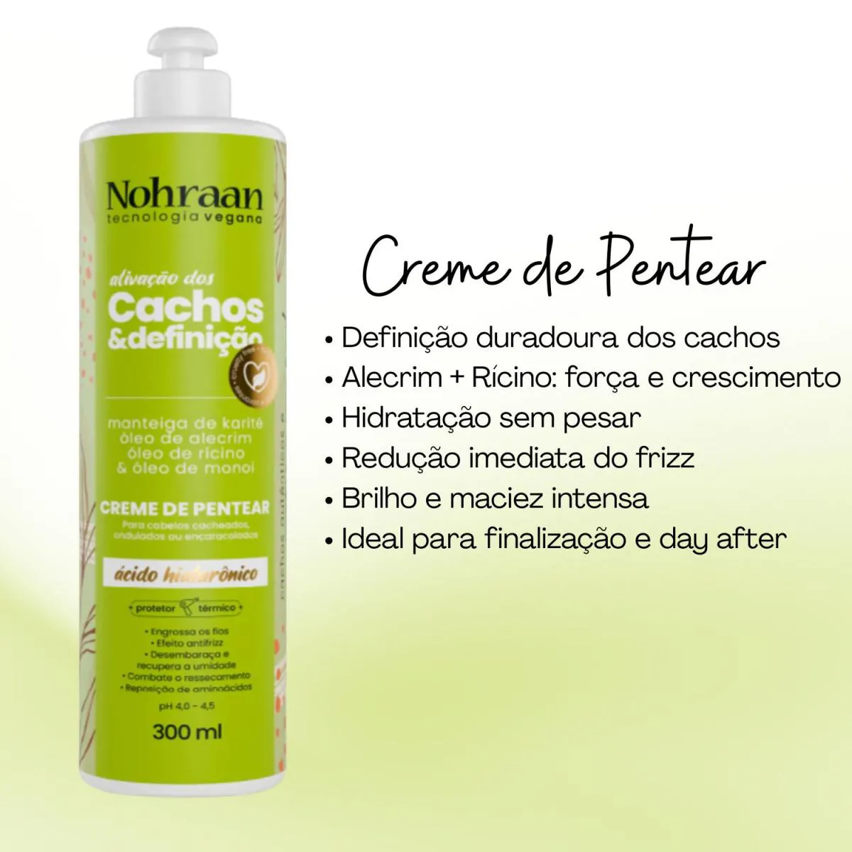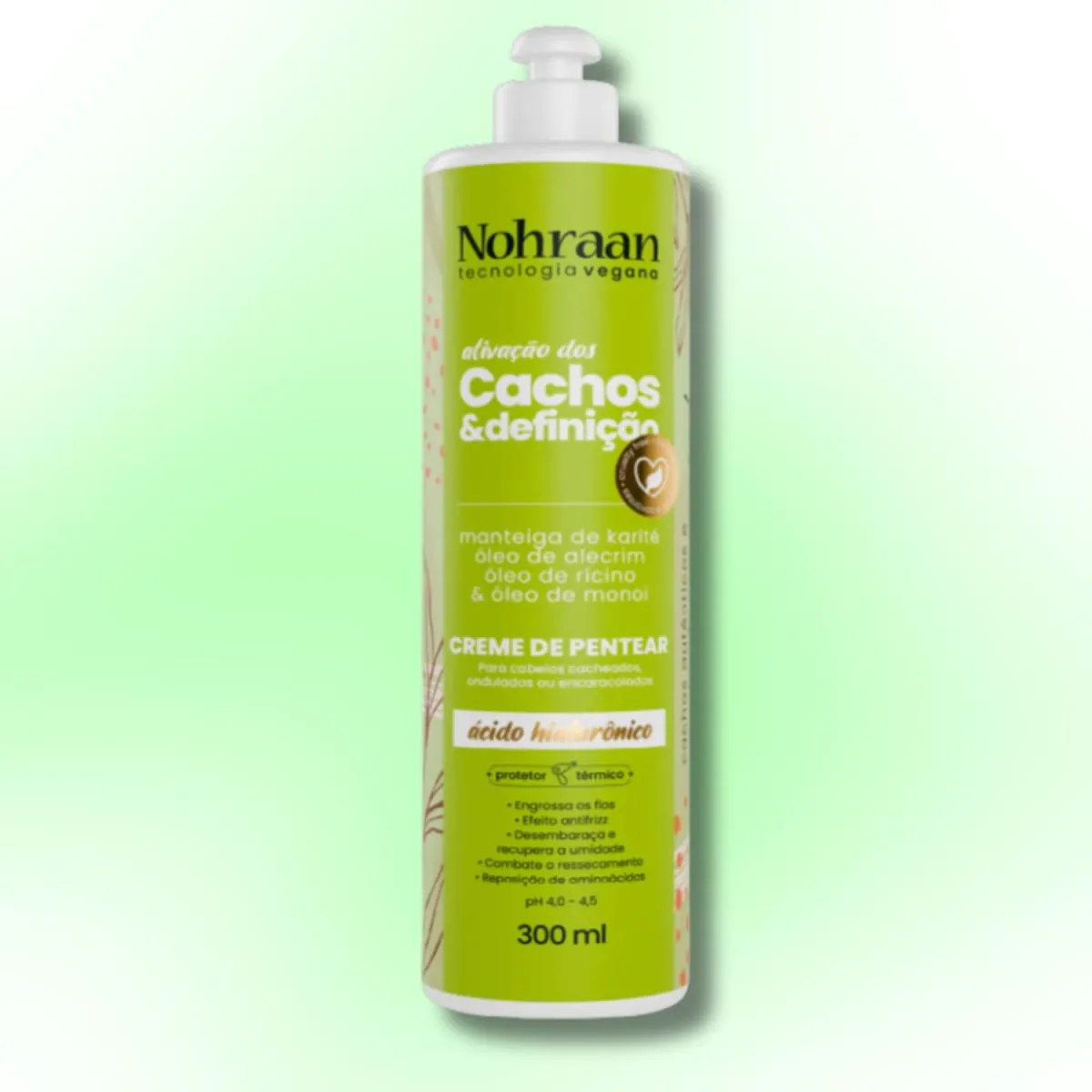 Nohraan Creme de Pentear Cachos Alecrim & Rícino 300ml O Creme de Pentear Nohraan Alecrim & Rícino foi criado para dar definição, maciez e controle de frizz aos cachos, mantendo os fios hidratados e alinhados ao longo do dia. Sua fórmula nutritiva fortalece, estimula o crescimento saudável e proporciona um acabamento leve e natural. Diferenciais