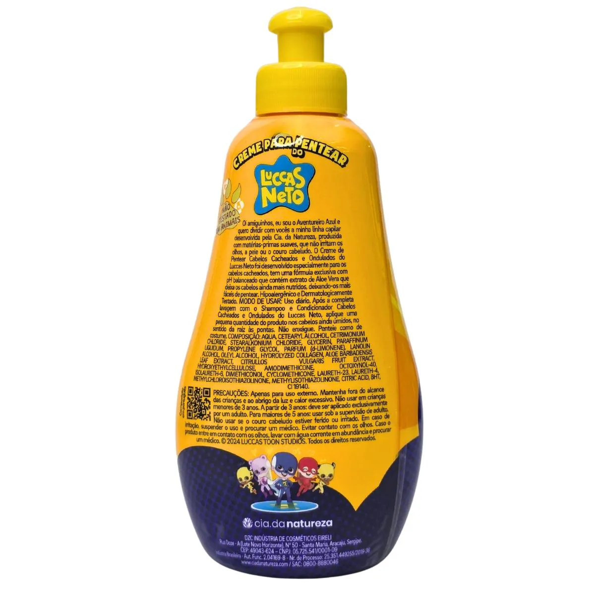 Finalidade: Oi amiguinhos, eu sou o Aventureiro Azul e quero dividir com vocês a minha linha capilar desenvolvida pela Cia. da Natureza, produzida com matérias-primas suaves, que não irritam os olhos, a pele ou o couro cabeludo. O creme para pentear Cabelos Cacheados e Ondulados do Luccas Neto foi desenvolvido especialmente para os cabelos Cacheados,tem uma fórmula exclusiva com pH balanceado que contém extrato de Aloe Vera que deixa os cabelos ainda mais nutridos, deixando-os mais fáceis de pentear. Hipoalergênico e Dermatologicamente testado.