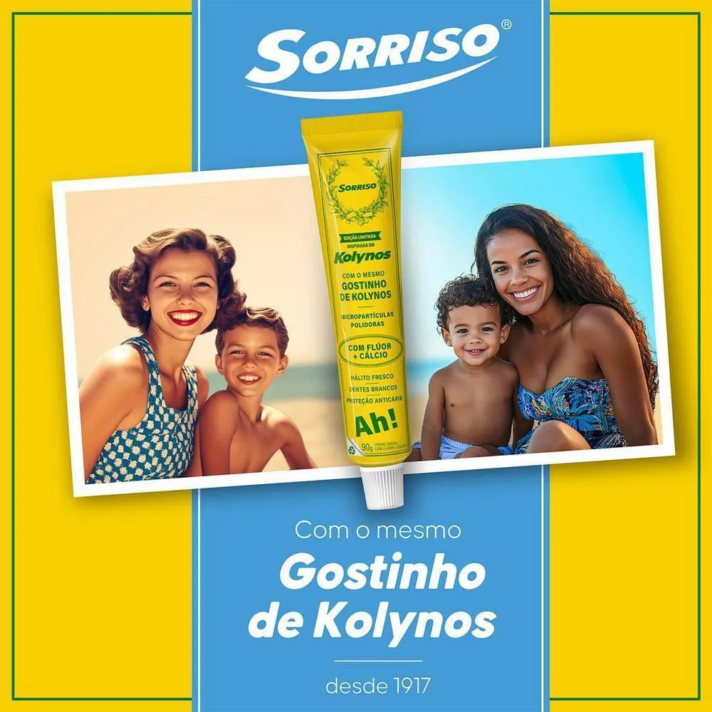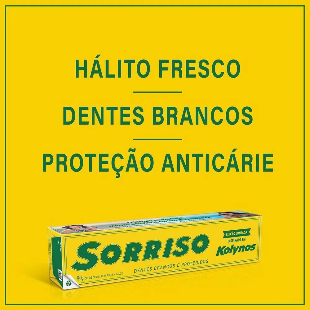 "A pasta de dente Sorriso Edição Limitada Kolynos traz o mesmo gostinho da versão de 1917, proporcionando refrescância e hálito fresco. Benefícios: Contém micropartículas polidoras que ajudam a manter os dentes brancos e limpos, proporcionando proteção eficaz. Oferece proteção anticárie para cuidar da saúde do seu sorriso. Mesmo gostinho clássico de Kolynos e a mesma refrescância que você conhece, garantindo um hálito sempre fresco."