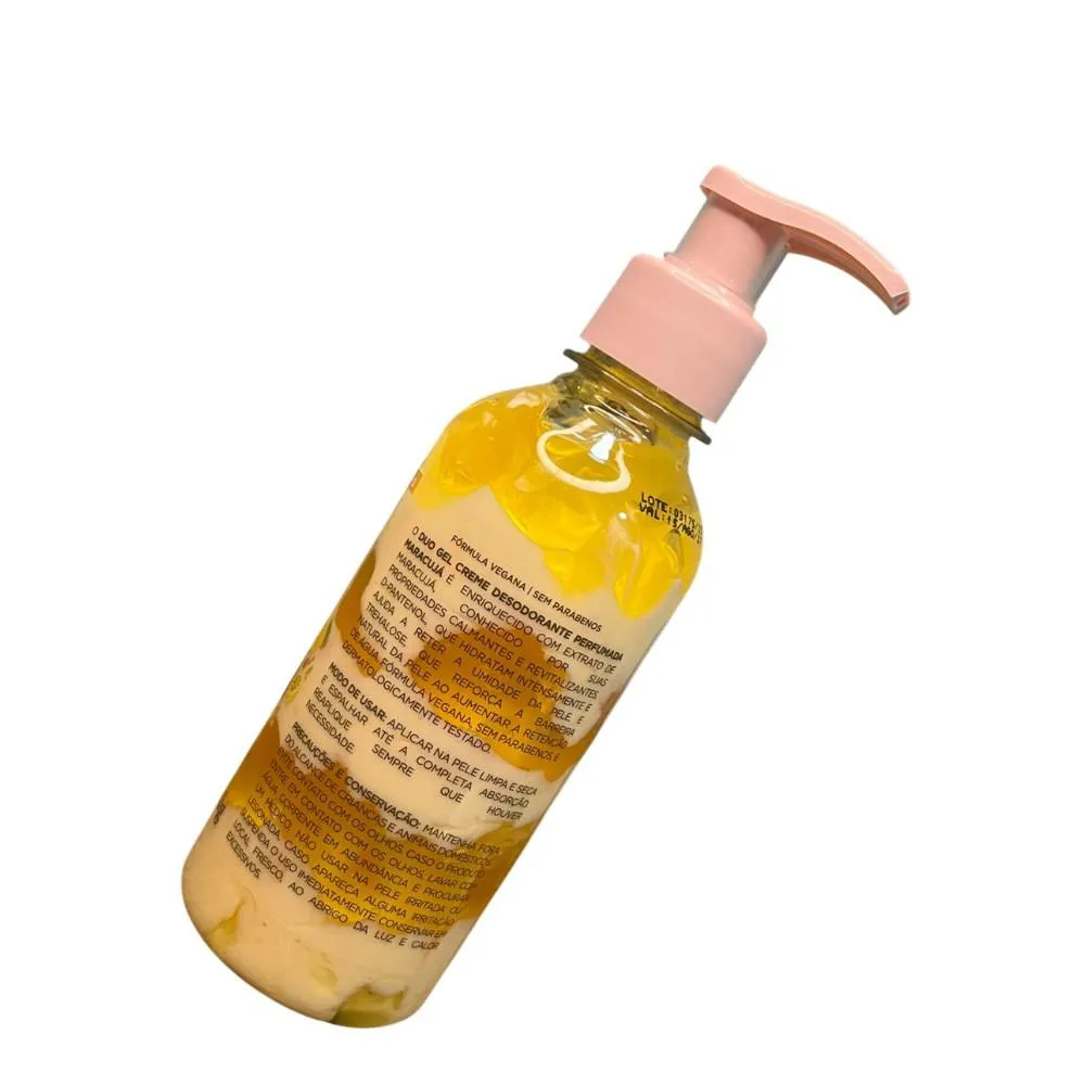 Um creme duo gel desodorante corporal com fragrância de Maracujá, desenvolvido para hidratar e perfumar a pele.