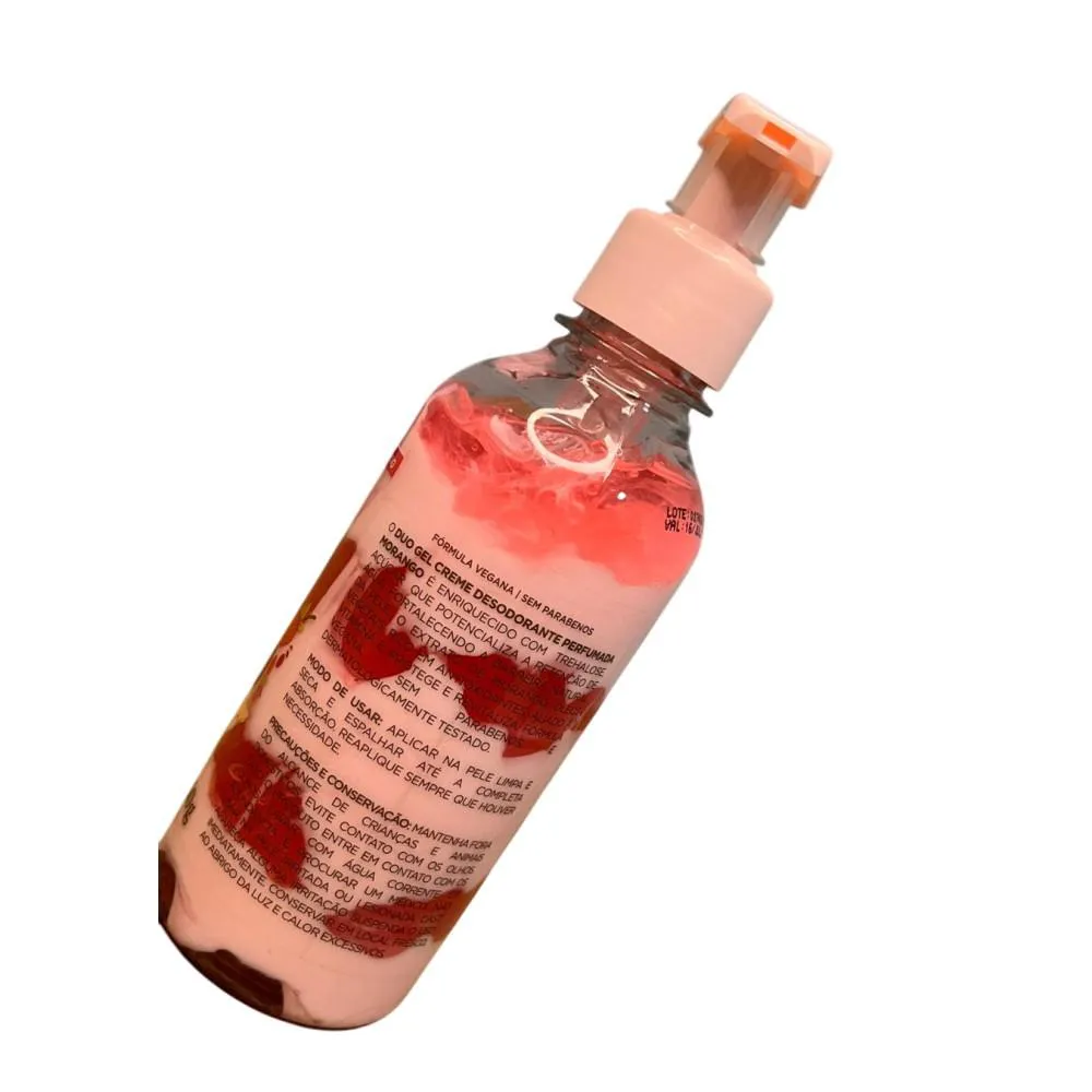 Um creme duo gel desodorante corporal com fragrância de Morango, desenvolvido para hidratar e perfumar.