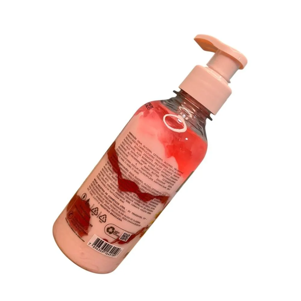 Água, Glicerol, Álcool Cetearílico, Óleo da Semente de Girassol, Triglicerídeo Caprílico/Cáprico, Álcool Cetílico, Trealose, Monoestearato de Glicerila, Estearato Peg-100, Perfume, Fenoxietanol, Extrato da Folha de Aloe Vera, Extrato de Morango, Dimetilidantoína, Trietanolamina, Carbômer, Manteiga de Karité, Cetearete-20, Sulisobenzona, Pantenol, Edetato Dissódico, Etilhexilglicerina, Poliacrilato de Sódio, Goma Xantana, Butil - Hidroxitolueno, Corante Vermelho de Ponceau 16255, Corante Vermelho Amaranto 16185, Corante Violeta 45190, Corante Amarelo de Tartrazina 19140.