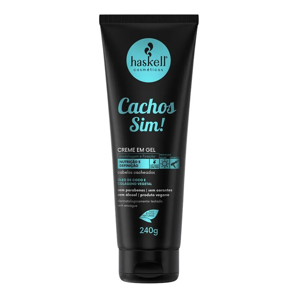 O Creme em Gel Cachos Sim! da Haskell é ideal para quem deseja definição e fixação para os cabelos cacheados. Perfeito para fixar penteados e remodelar no day after, este produto valoriza a beleza l dos cachos enquanto nutre e fortalece os fios. Sua rica em óleo de coco e colágeno promove hidratação profunda e definição, além de ser livre de sulfatos, petrolatos e parabenos. Com proteção térmica e solar, este creme em gel é ideal para cuidar dos seus cachos diariamente. Indicação: Cabelos cacheados Benefícios: Promove definição e fixação Ideal para fixar penteados e remodelar no day after Nutre e fortalece os fios Hidratação profunda livre de sulfatos, petrolatos e parabenos Proteção térmica e solar Direção olfativa: Floral, fruity, gourmand, oriental Especificações: Sem parabenos | Sem corantes Proteção térmica | Proteção solar Sem enxágue Low poo DÚVIDAS FREQUENTES: Qual a validade do produto? Haskell tem validade de 2 anos a partir da data de fabricação. Tem em estoque? Temos todos os nossos produtos disponíveis para . Produto? Adquirido diretamente do distribuidor autorizado Haskell. personalizado? Elaboração de kits sob medida. OBSERVAÇÕES SOBRE A COMPRA: Mimos e + mimos e com o pedido sempre tem um cupom! Sabia!? Compras efetuadas até as 14 hrs serão enviadas no mesmo dia. Compras efetuadas sexta-feira após as 14 hrs serão enviadas no dia útil seguinte. Todos os produtos são enviados com . Caso seu produto chegue não se preocupe, fale com a gente! Quantidade de itens: | Principais Características do Produto 2: | Aviso de : | Ingredientes: | Palavras-chave de Pesquisa: | Baterias são necessárias?: | Contém conteúdo líquido: | Volume do item: | Principais Características do Produto 0: | Gênero do público-alvo: | Formato do item: | Preço sugerido sem impostos: | Tipo de cabelo: | Palavra-chave do público-alvo: | Fonte de energia: | Estilo de vida: | Principais Características do Produto 1: | Contagem de unidades: | O Produto pode Expirar: | Informações sobre alérgenos: | Aroma: | Fabricante: