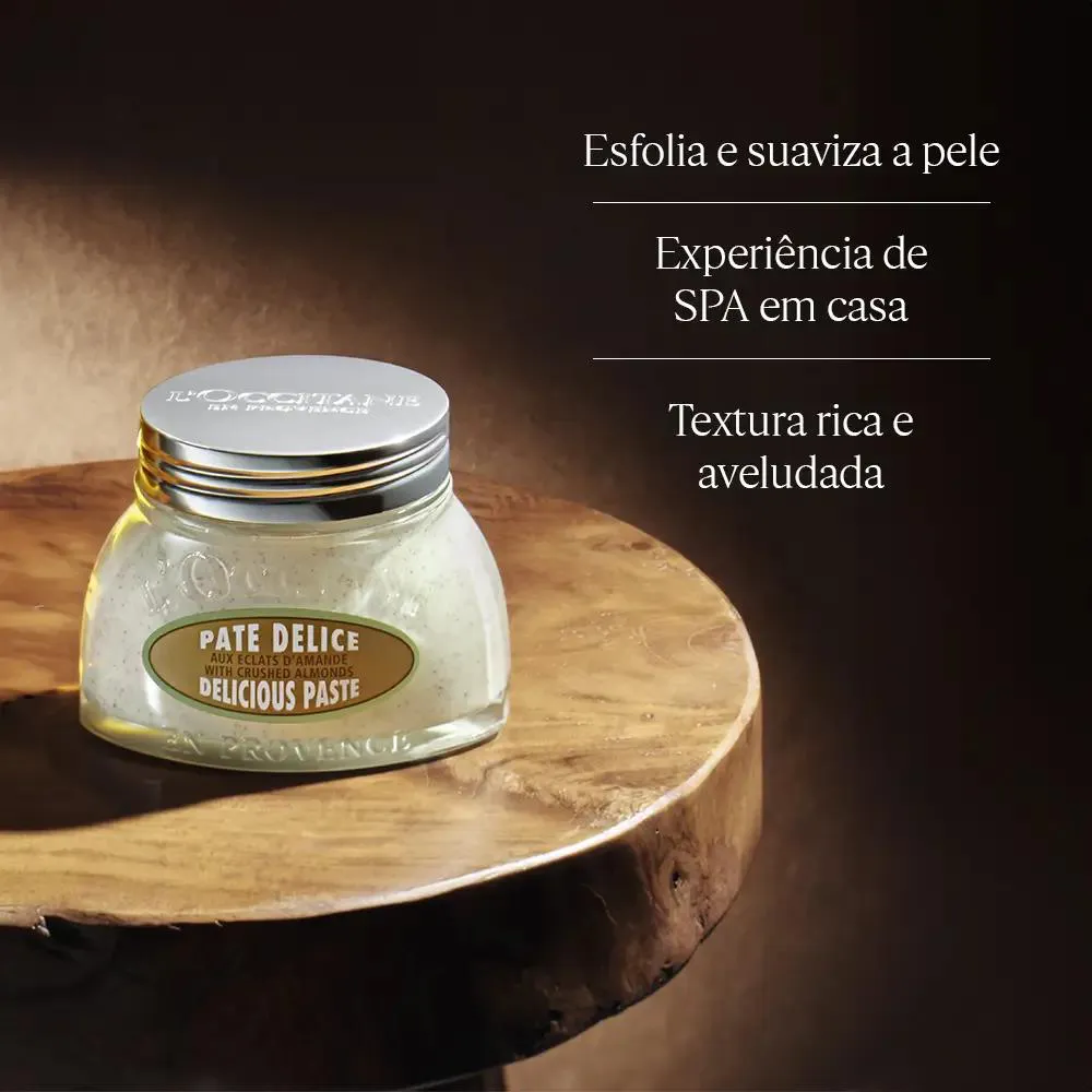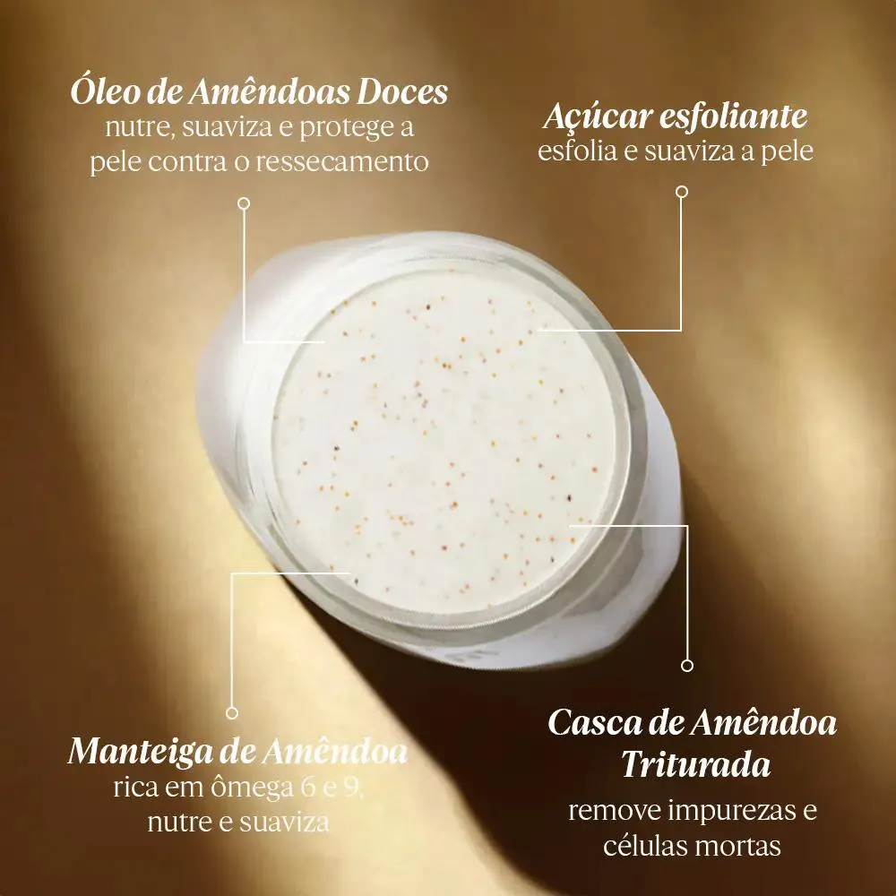 Creme esfoliante de Amêndoa. Uma deliciosa combinação de manteiga, extrato e óleo de amêndoas, com cascas de amêndoas trituradas e cristais de açúcar, este creme esfoliante proporciona uma esfoliação perfeita para o corpo todo. Com textura de manteiga corporal com cristais de açúcar e cascas de amêndoas, que se transformam num leite corporal quando em contato com a água: a esfoliação se torna um momento de pura doçura. Modo de usar: Massageie com movimentos circulares de baixo para cima. Use uma ou duas vezes por semana no chuveiro, depois enxágue. Bônus: este creme de textura suave e extremamente rica e densa se transforma num leite leve quando em contato com a água.