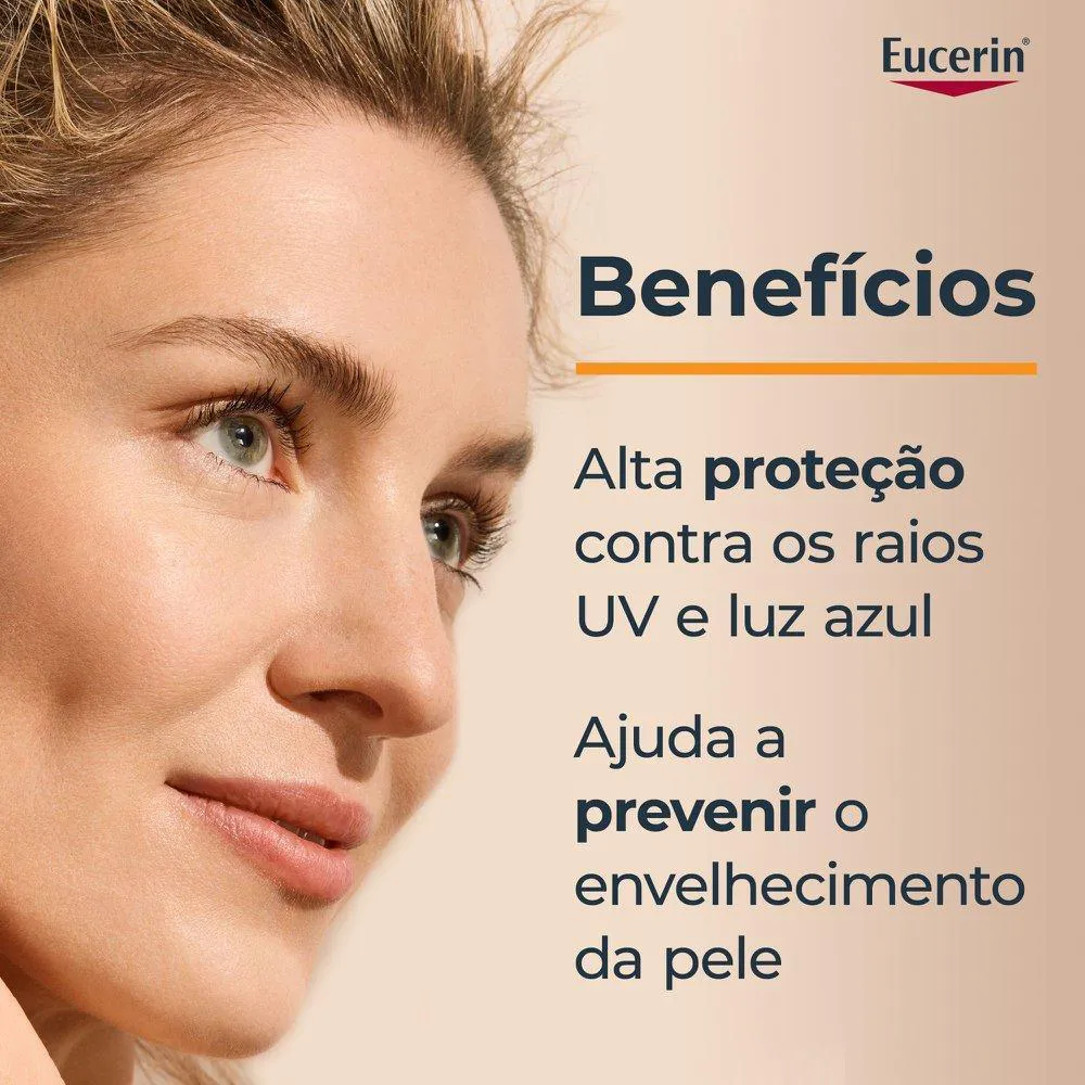 O Eucerin Protetor Solar Facial Anti-idade FPS 50 é um protetor solar facial com fórmula anti-envelhecimento, desenvolvido com tecnologia ADVANCED SPECTRAL TECHNOLOGY e ingredientes ativos como Ácido Hialurônico e Licochalcona A. Possui textura ultraleve e rápida absorção.