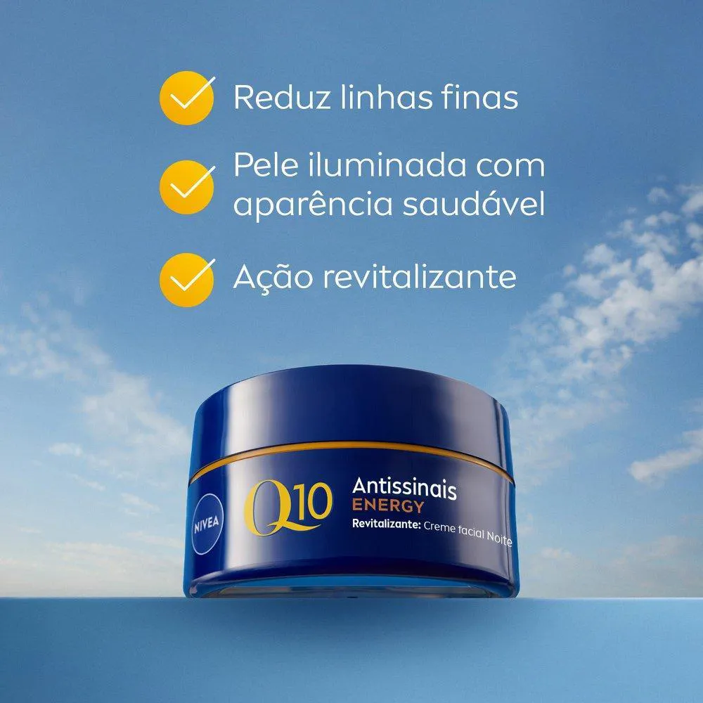 O que é?O NIVEA Creme Facial Antissinais Q10 Power Energy Noite é um creme inovador, formulado para o cuidado intensivo da pele. Ele proporciona uma ação antissinais eficaz, promovendo uma pele mais iluminada, com uma aparência saudável.
