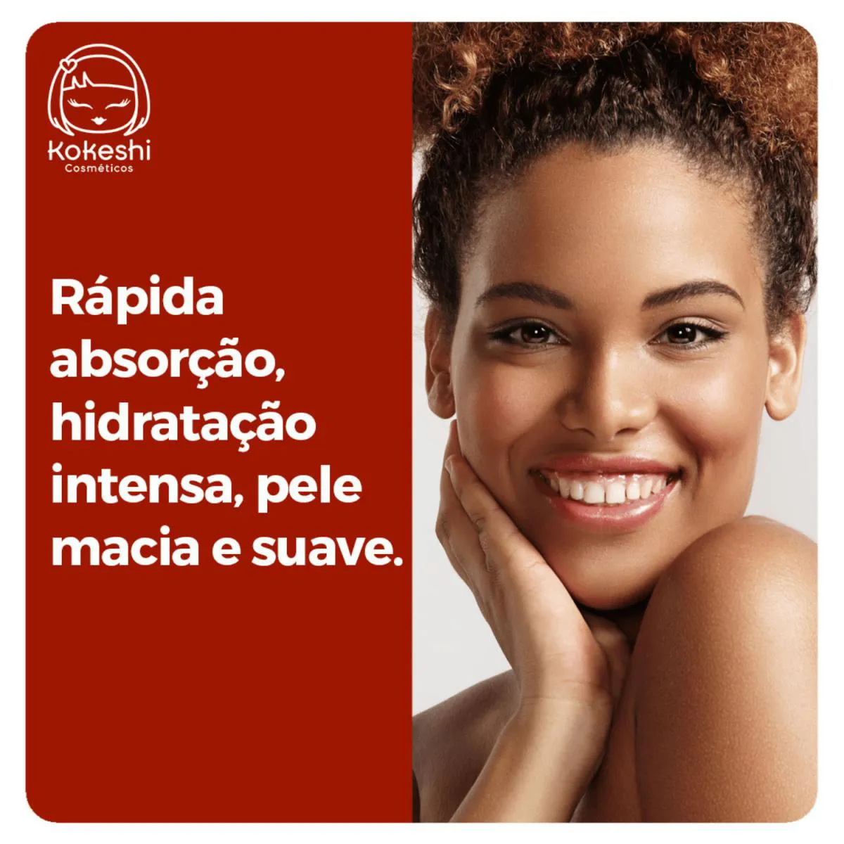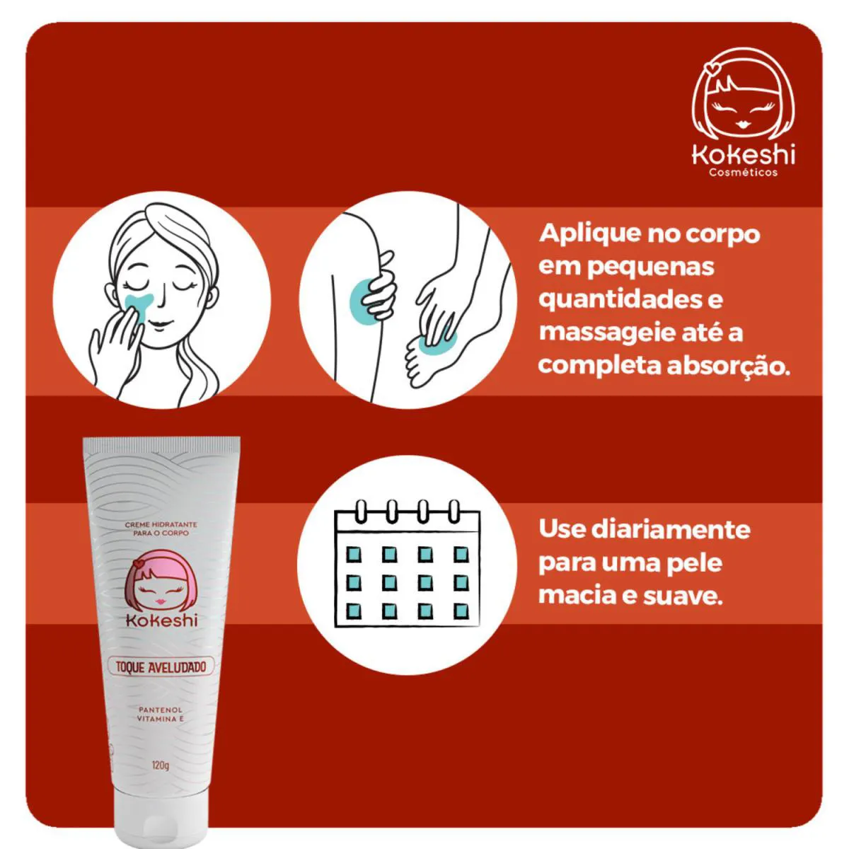 O creme hidratante corporal da Kokeshi, garante alivio para o ressecamento da pele, com uma textura leve e de rápida absorção, proporcionando uma pele hidratada, macia e suave.