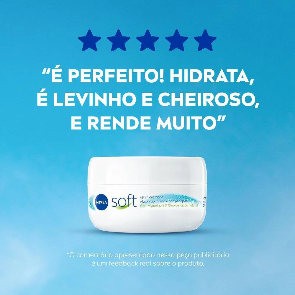 O que é?O NIVEA Soft é um creme hidratante altamente eficaz, desenvolvido para o uso diário em todos os tipos de pele. Ele é conhecido por sua fórmula leve e refrescante, que combina vitamina e e óleo de Jojoba. Esses ingredientes ajudam a nutrir e proteger a pele, oferecendo hidratação suave e duradoura por 48 horas.