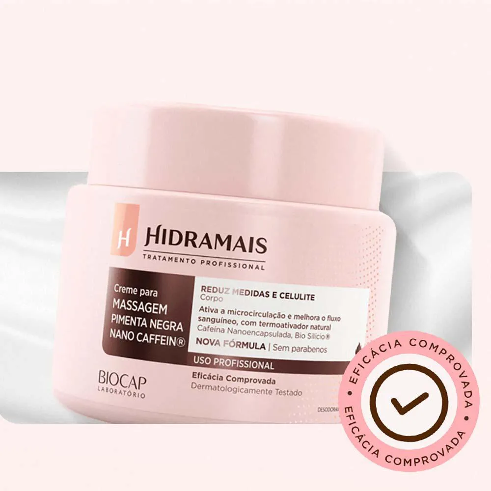 O Creme para Massagem Pimenta Negra Caffein Hidramais é um produto com nanotecnologia de uso corporal indicado para quem busca redução de medidas.