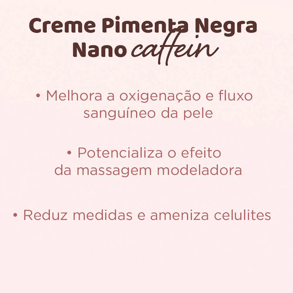 O Creme Pimenta Negra Nano Caffein promove a melhora da oxigenação e do fluxo sanguíneo, potencializando o efeito da massagem modeladora, com ação e eficácia comprovada na redução de medidas. O produto contém Pimenta Negra, ativo natural de aquecimento e cafeína nanoencapsulada.