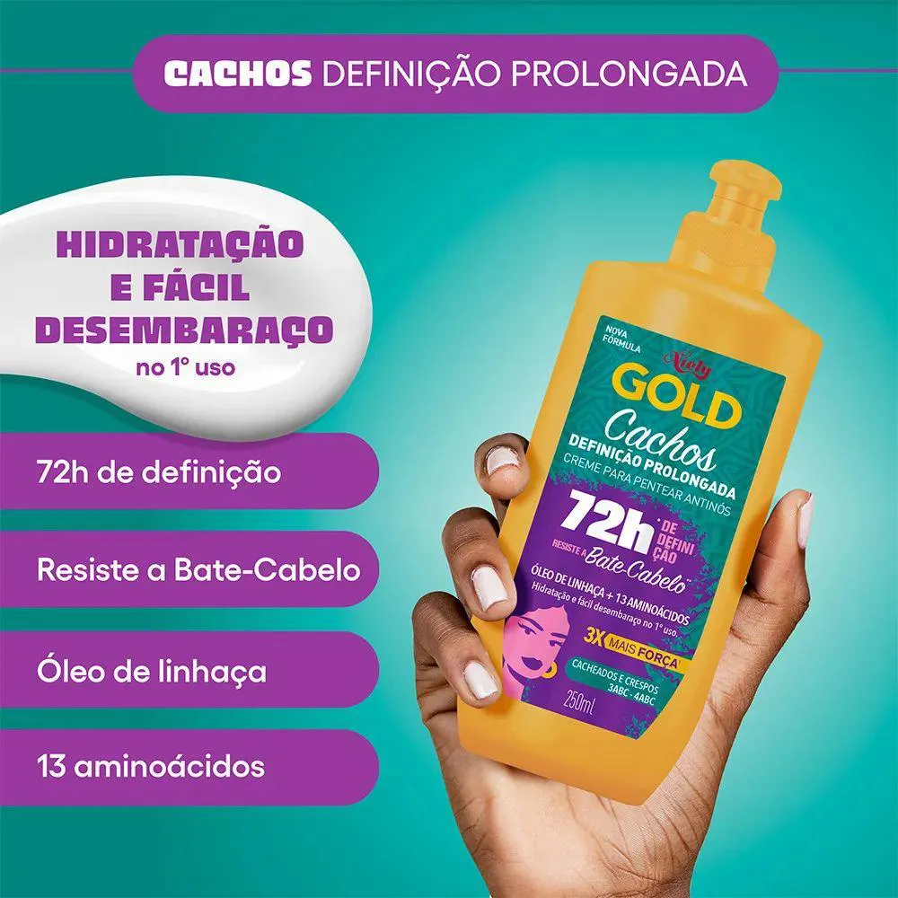 Forca, definicao e protecao para seus cachos com Niely Gold O creme para pentear Niely Gold Ativador de Cachos foi desenvolvido para deixar seus cabelos cacheados ainda mais fortes, definidos e protegidos. Com oleo de linhaca e 13 aminoacidos fortalecedores, promove ate 3x mais forca, acao antiquebra e selagem dos fios. Conta ainda com protecao termica e definicao que dura ate 72 horas, resistindo ate ao bate-cabelo. Pratico e sem enxague, e o aliado perfeito para quem busca fios macios, soltos e cheios de movimento todos os dias. Ficha tecnica Marca: Niely Gold Produto: Creme para Pentear Ativador de Cachos Volume: 250ml Ativos: Oleo de linhaca e 13 aminoacidos fortalecedores Beneficios: Acao antiquebra, selagem dos fios, protecao termica, ate 3x mais forca e 72h de definicao Modo de uso: Aplicar nos cabelos umidos apos shampoo e condicionador, do comprimento as pontas. Nao enxaguar. Modelar como desejar. Indicacao: Cabelos cacheados Validade: Impressa na embalagem