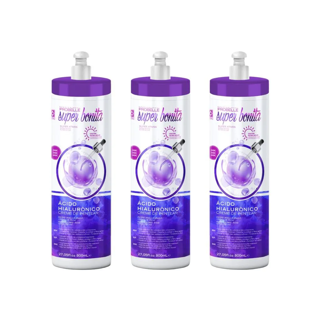 creme para pentear PROBELLE SUPER BONITA 800ML ÁCIDO HIALURÔNICO - KIT C/ 3UN Descrição O Creme para Pentear Probelle Super Bonita Ácido Hialurônico 800ml é a escolha ideal para quem busca hidratação intensa e revitalização dos fios. Formulado com ácido hialurônico, atua como um reservatório de água, promovendo hidratação profunda, brilho e toque sedoso. Sua ação revitalizante restaura a luminosidade natural dos cabelos, deixando-os mais saudáveis, fortes e resistentes. Além disso, combate o frizz, define cachos e ondas, e facilita o penteado no dia a dia. Indicado para todos os tipos de cabelo. Modo de Uso Com os cabelos limpos e úmidos, aplique o creme uniformemente no comprimento e pontas. Penteie como de costume. Não é necessário enxaguar. Pode ser usado diariamente.