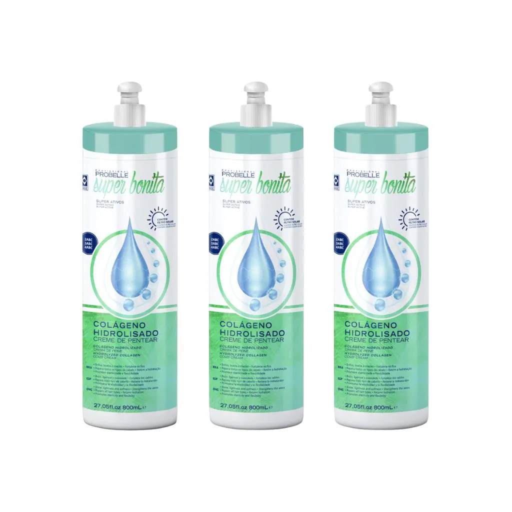creme para pentear PROBELLE SUPER BONITA 800ML colágeno HIDROLISADO - KIT C/ 3UN Descrição O Creme Para Pentear Probelle Super Bonita 800ml Colágeno Hidrolisado oferece força, elasticidade e hidratação profunda aos cabelos, sendo ideal para fios frágeis, quebradiços e sem vida. Enriquecido com colágeno hidrolisado, ele age na fibra capilar restaurando a estrutura dos fios, promovendo resistência, brilho e maciez desde a primeira aplicação. Sua fórmula leve facilita o desembaraço e ajuda a controlar o frizz, deixando os cabelos saudáveis e protegidos contra agressões externas. Modo de Uso Aplique o Creme Para Pentear Probelle Super Bonita Colágeno Hidrolisado nos cabelos úmidos ou secos, espalhando uniformemente do comprimento às pontas. Não é necessário enxaguar. Penteie como de costume e finalize do jeito que preferir. Pode ser usado diariamente para manter os cabelos fortes, hidratados e maleáveis.