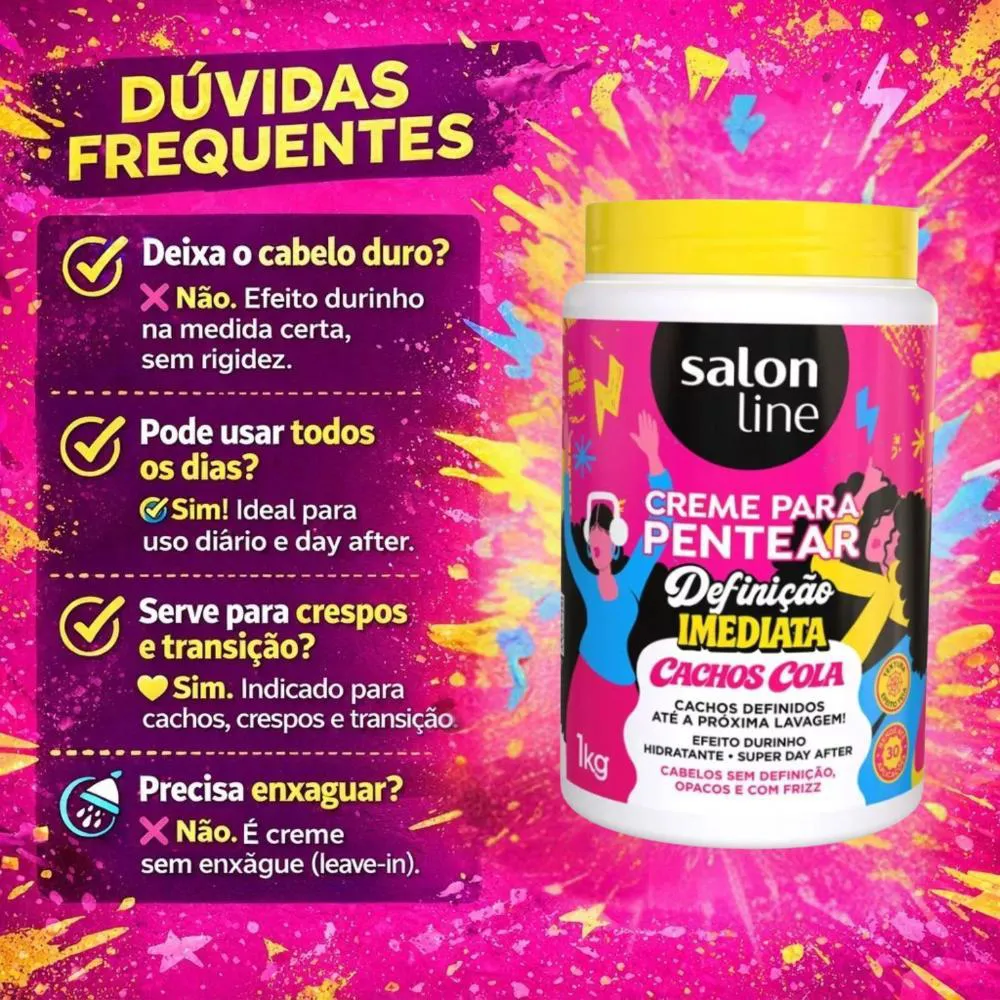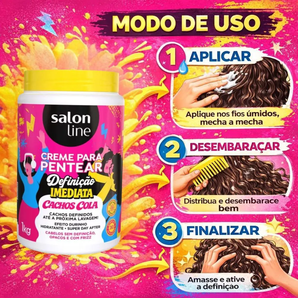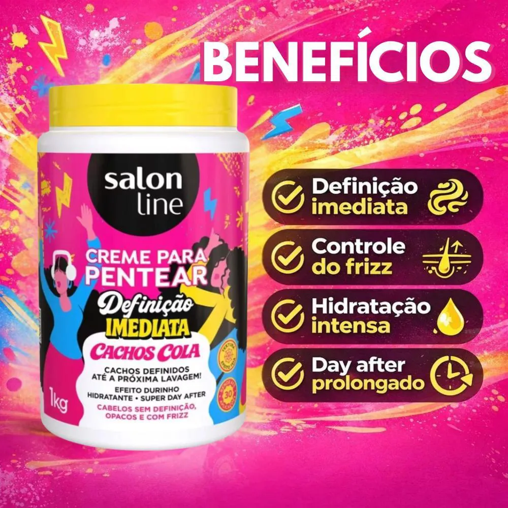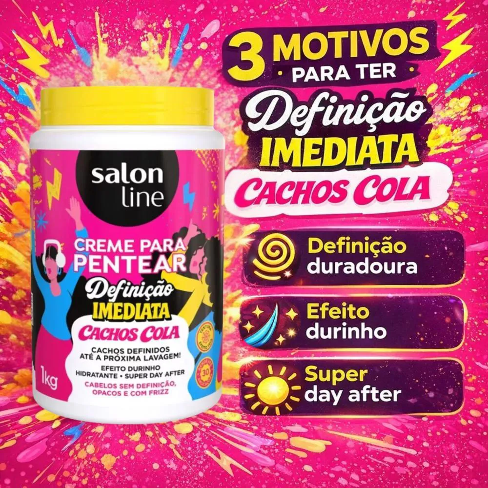 Descubra o poder da definição perfeita e imediata para seus cachos com o Creme Para Pentear Salon Line Definição Imediata Cachos Cola 1kg. Desenvolvido para quem busca cachos impecáveis e com fixação duradoura, este creme de pentear da Salon Line é a solução ideal para modelar, controlar o frizz e garantir um visual deslumbrante. Sua fórmula exclusiva proporciona uma "cola" para os cachos, mantendo-os definidos por muito mais tempo, atendendo às necessidades de quem não abre mão de praticidade e resultados profissionais no dia a dia. Ideal para quem busca praticidade e definição duradoura, este creme é um aliado essencial na rotina de cuidados com os cabelos cacheados.Benefícios Principais