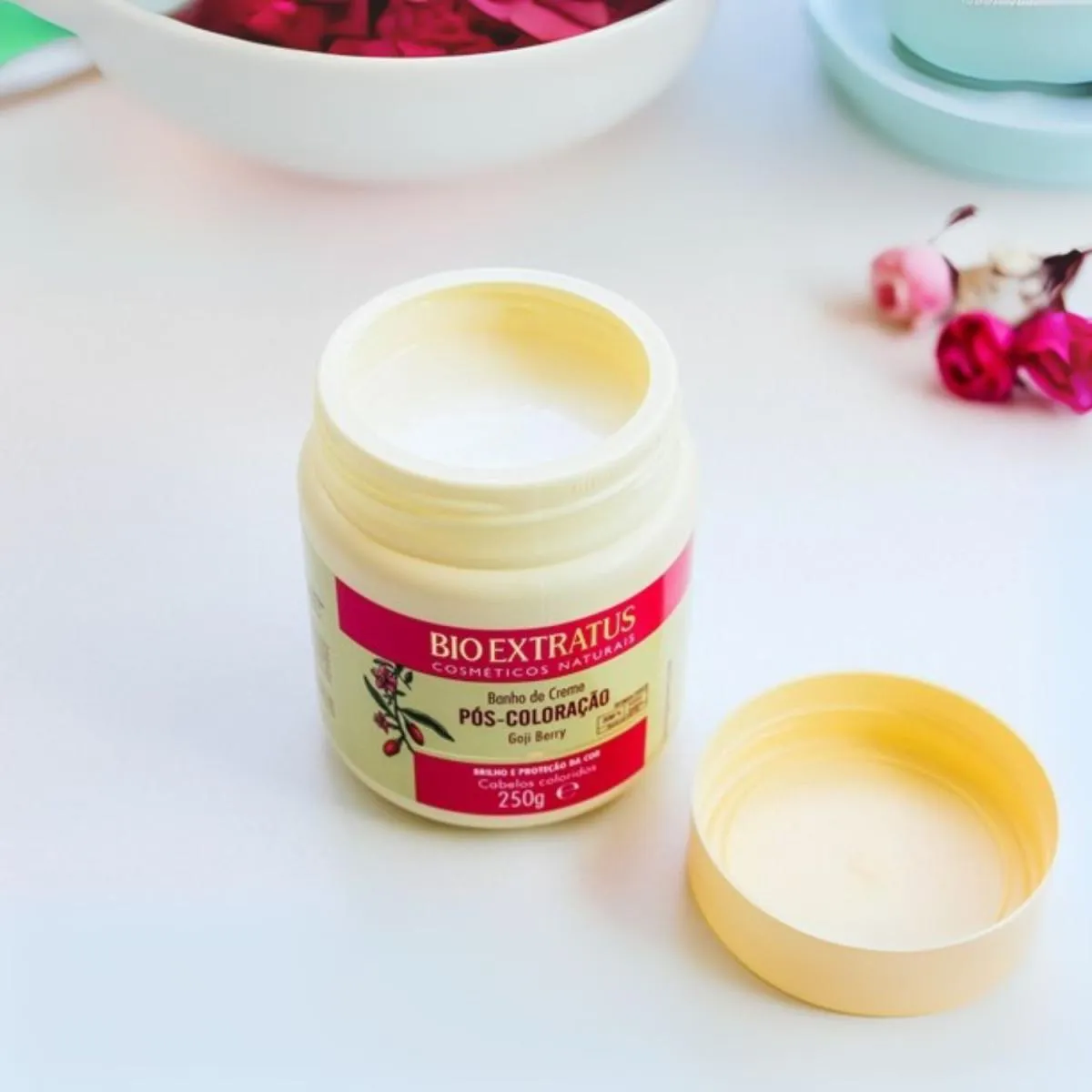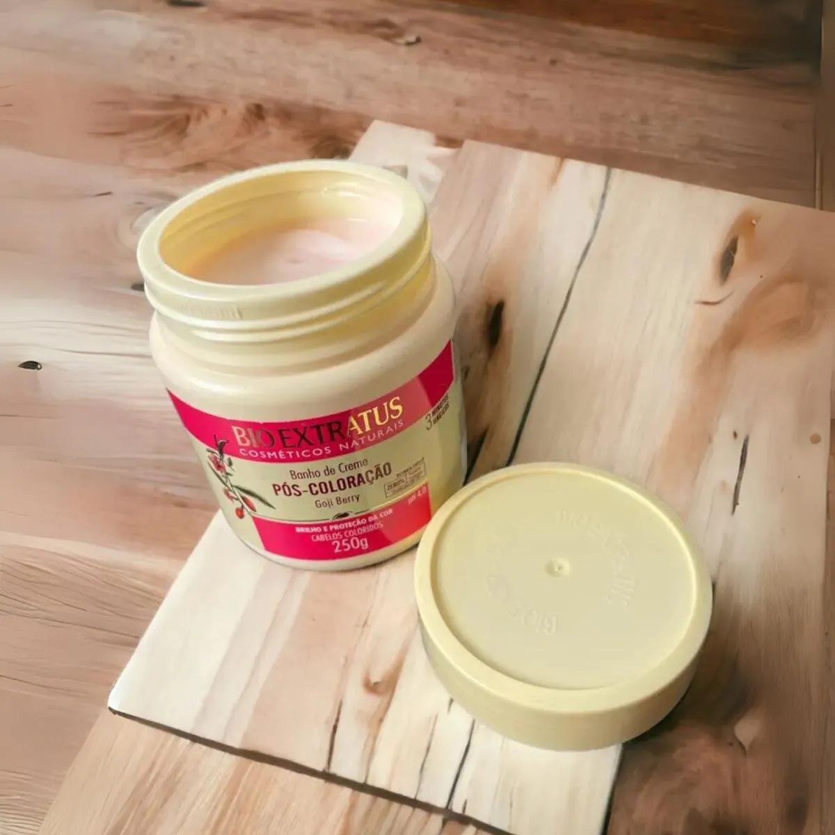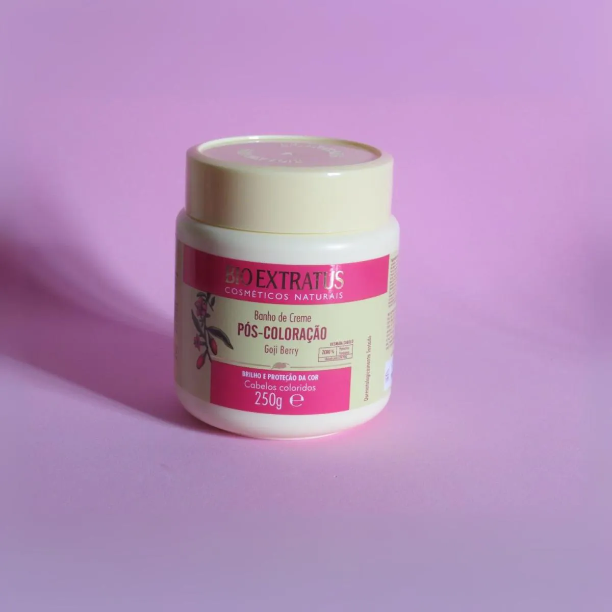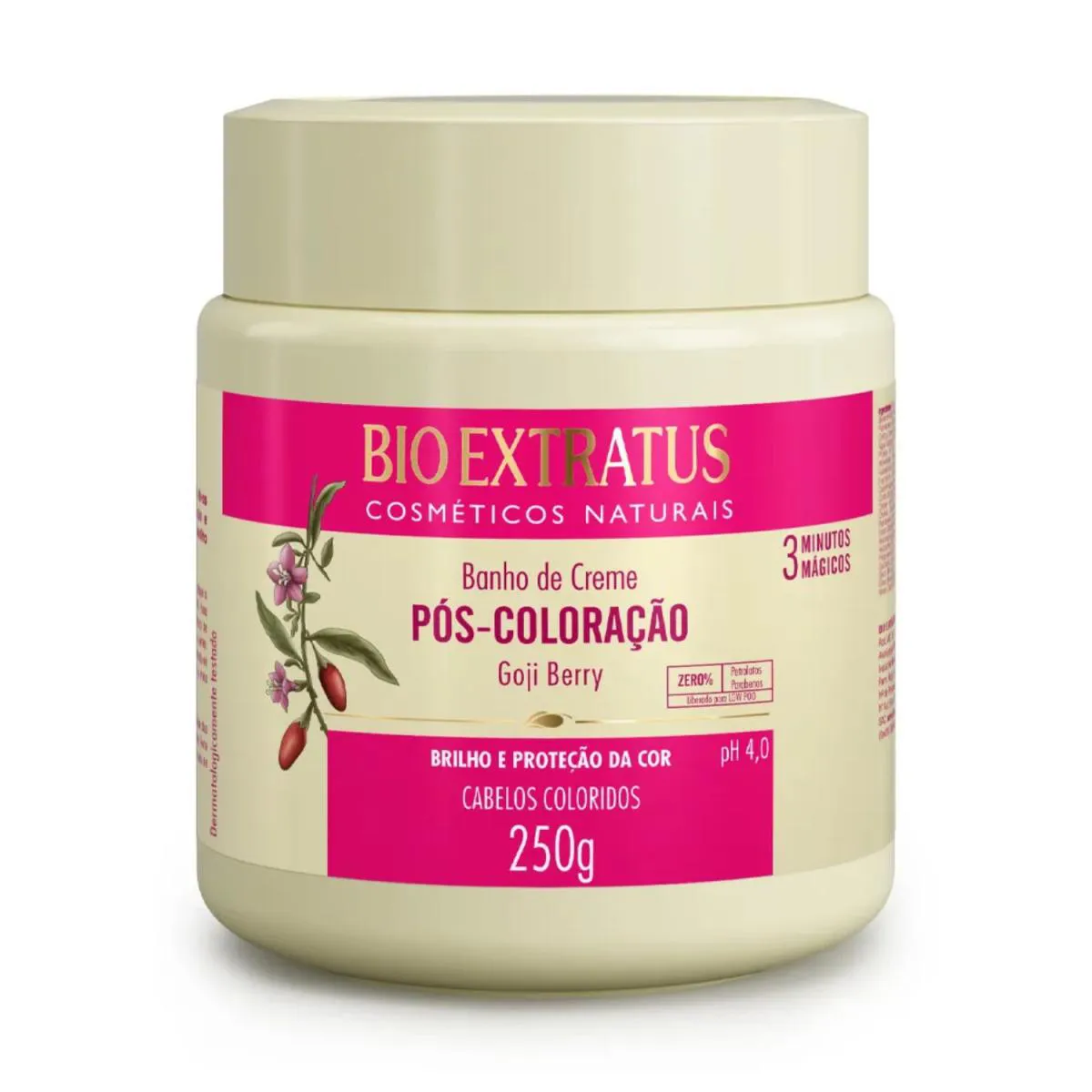 Creme Pós-Coloração Goji Berry 250g – Bio Extratus Cuidado intensivo para cabelos tingidos! O Creme Pós-Coloração Bio Extratus com Goji Berry foi formulado para tratar os fios após a coloração, oferecendo mais proteção, brilho e fixação da cor. Sua composição é rica em antioxidantes que ajudam a manter a cor vibrante por mais tempo, enquanto restauram a vitalidade dos cabelos quimicamente transformados, deixando-os macios, nutridos e com brilho intenso. • Protege e realça a durabilidade da cor