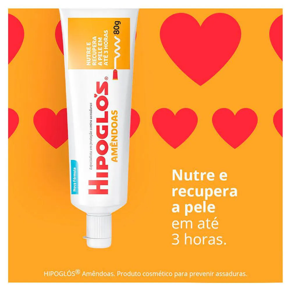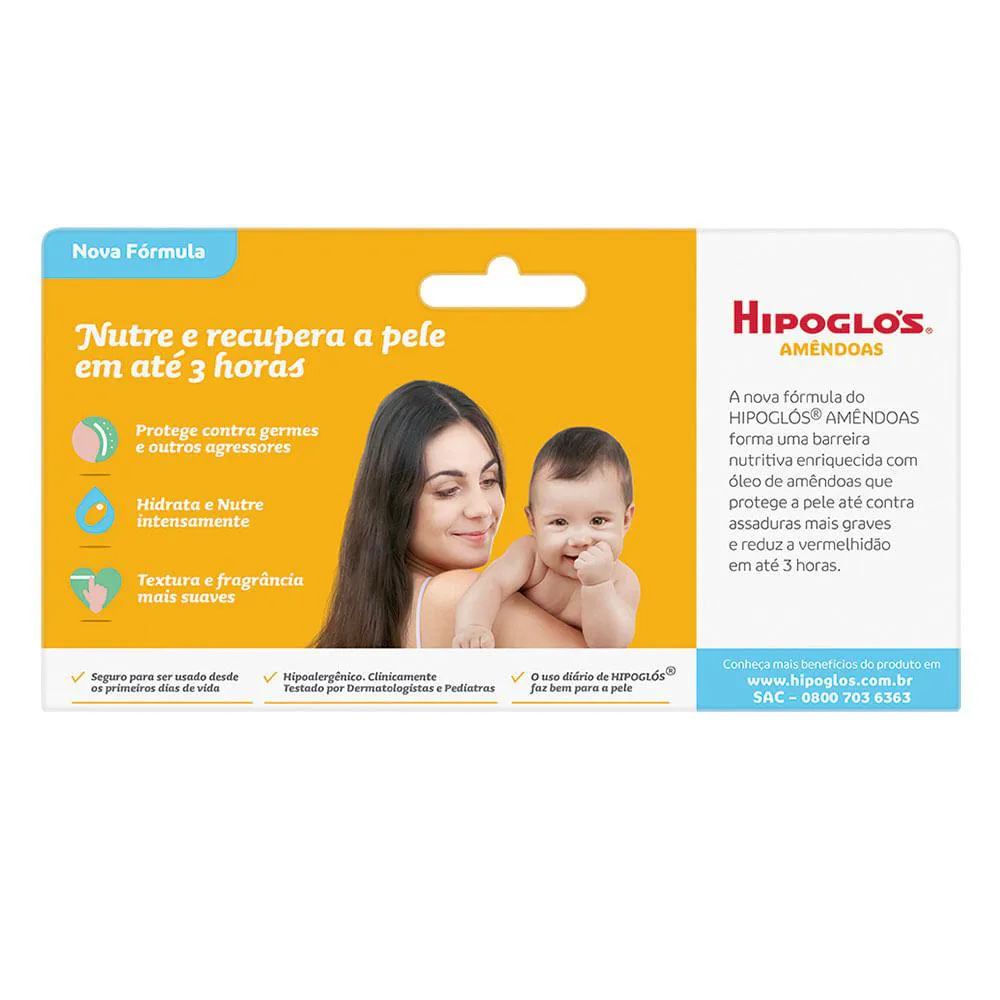 A fórmula do Hipoglós AMÊNDOAS forma uma barreira nutritiva enriquecida com óleo de amêndoas que protege a pele até contra assaduras mais graves e reduz a vermelhidão em até 3 horas.