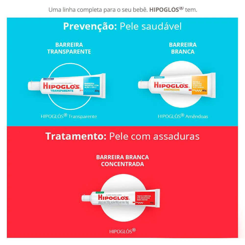 A cada troca de fraldas, limpe e seque cuidadosamente a pele do bebê e aplique uma camada generosa de Hipoglós sobre a área a proteger, massageando suavemente.